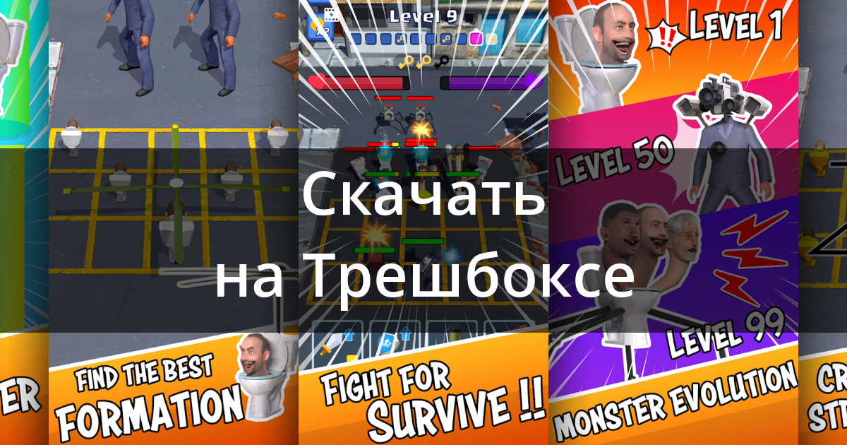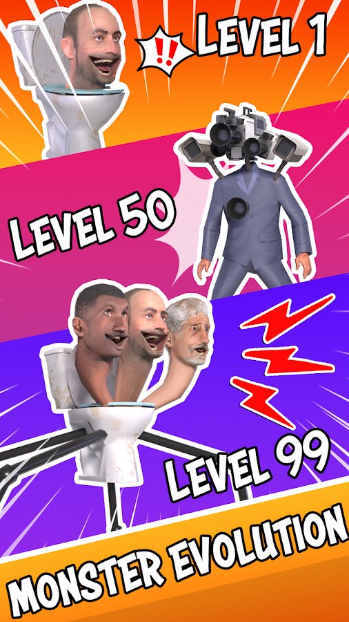 - Стратегически выстраивайте свою армию монстров Скибиди для сражений.