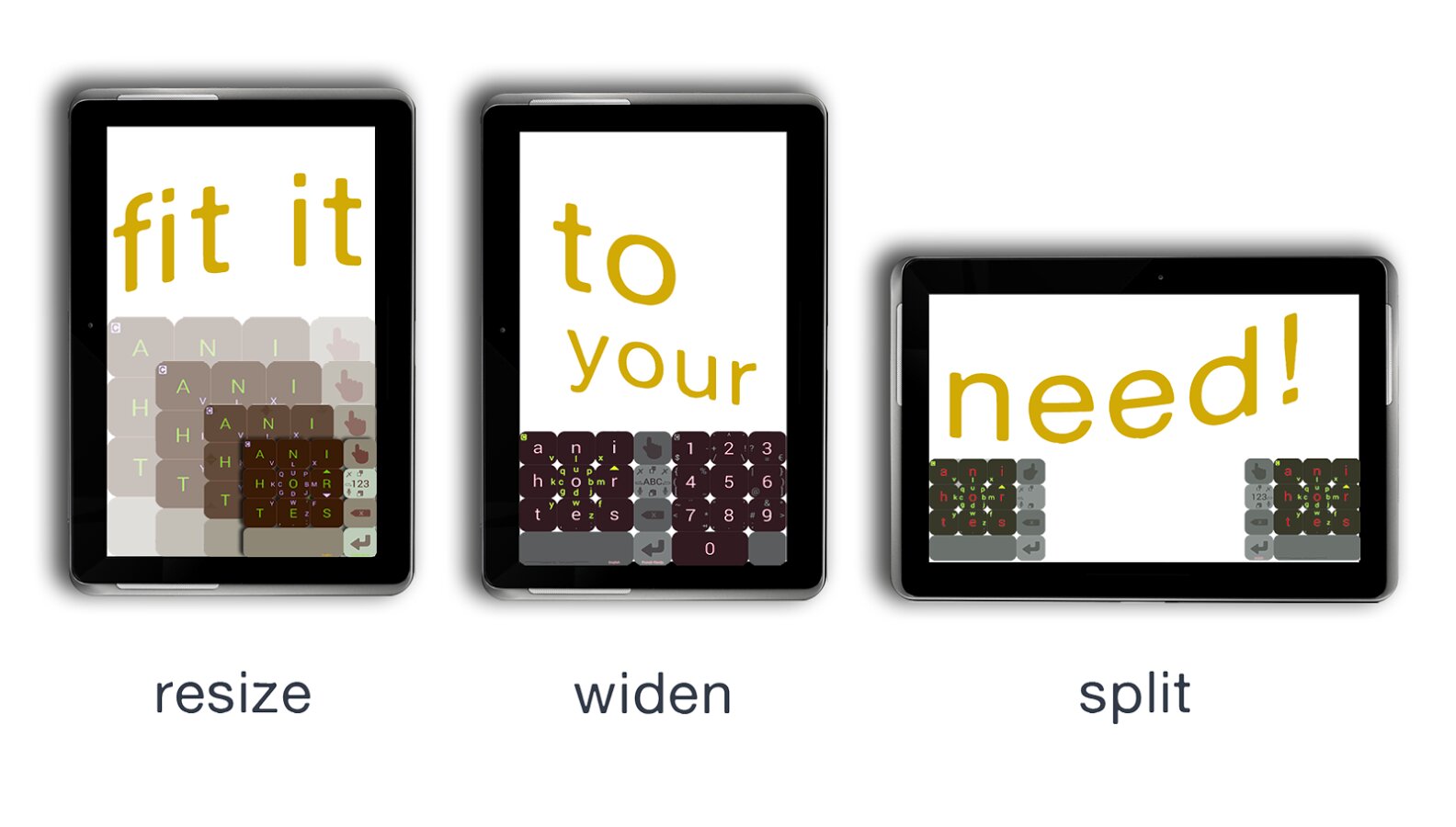 - Возможность изменять занимаемый размер клавиатурой на экране (уменьшать/увеличивать/скрывать полностью).