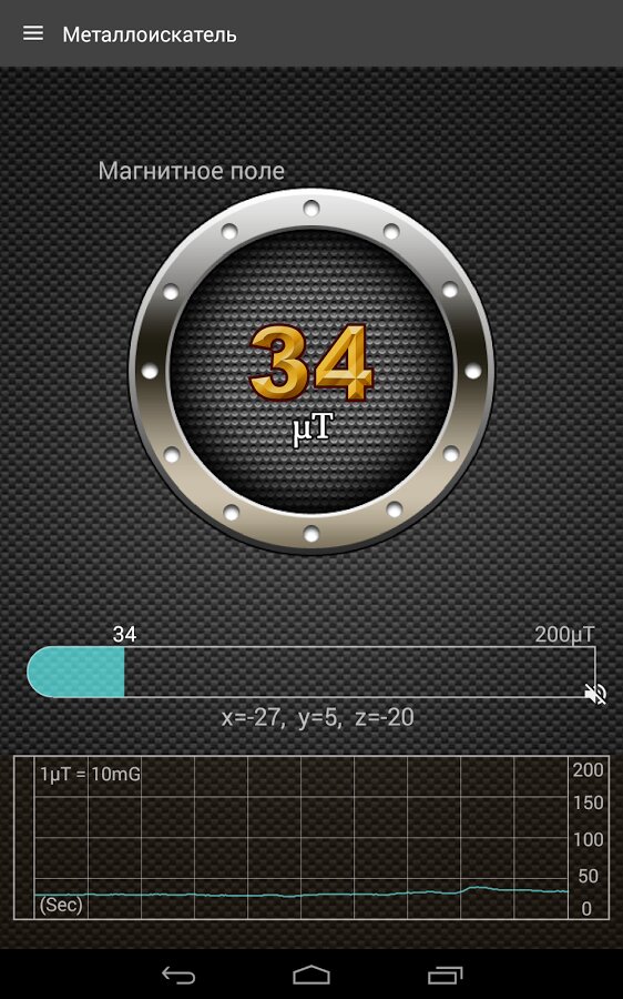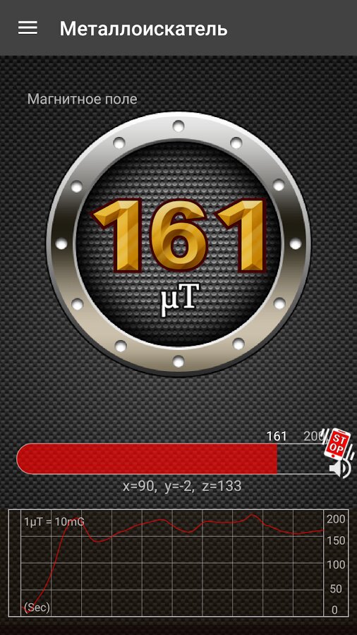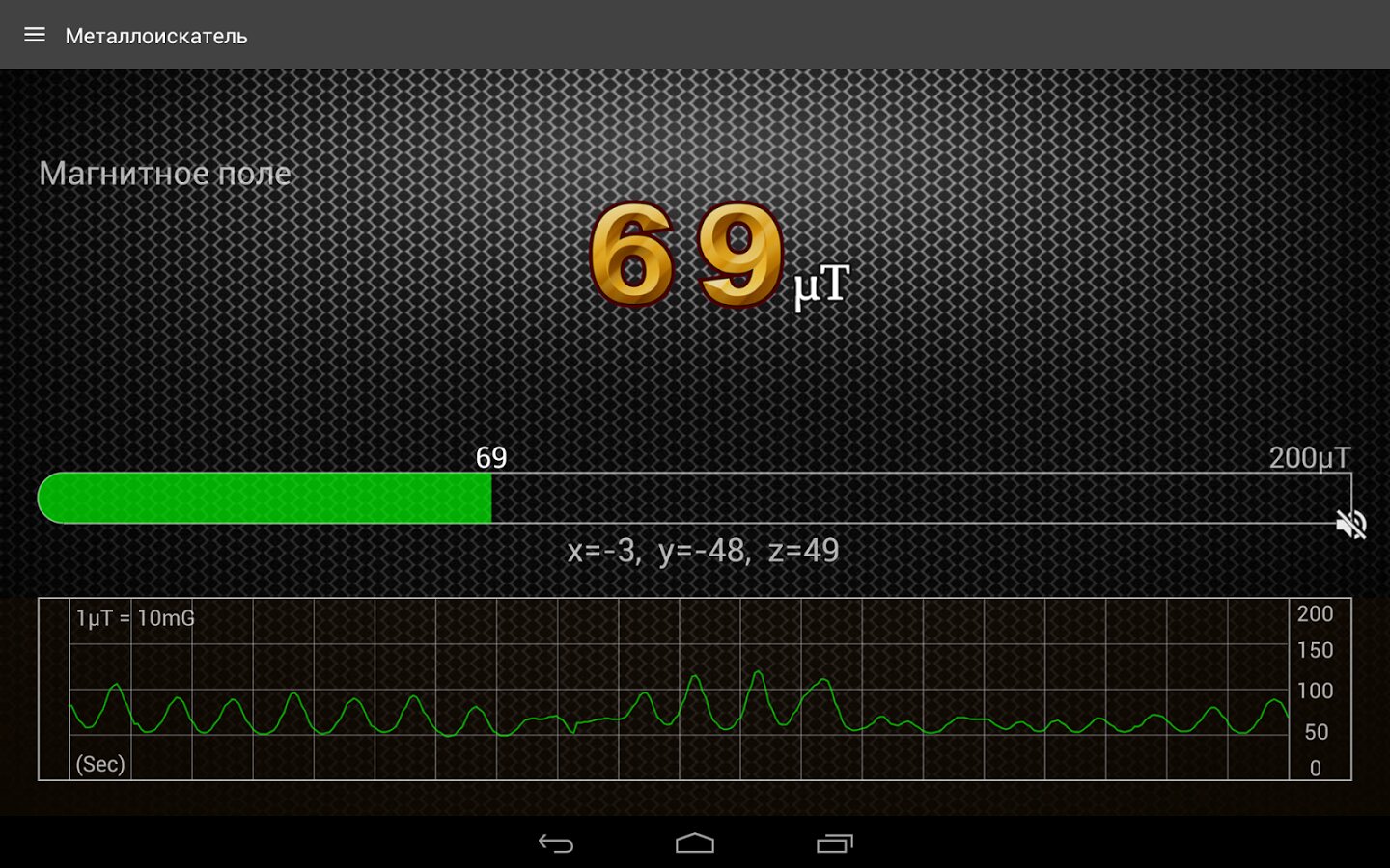 Металлоискатель — утилита для Android, позволяющая при помощи смартфона или планшета искать металлические предметы. Поиск основан на измерении магнитного поля встроенными датчиками гаджета. Если в обычных условиях магнитная индукция составляет 30-50 μT, то при приближении к металлическому объекту этот показатель значительно возрастает. Вы можете настроить звуковой сигнал, его тип и громкость, а также вибрацию при обнаружении металла.