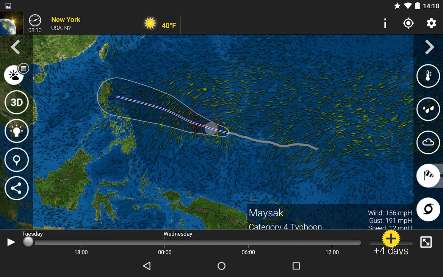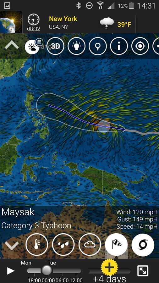 • Новые и улучшенные элементы погоды включая радар вида осадков (Вы увидите разницу между дождем и снегом), отслеживатель молний (Вы найдете его в слое облачности) и отслеживатель гроз (Премиум).
