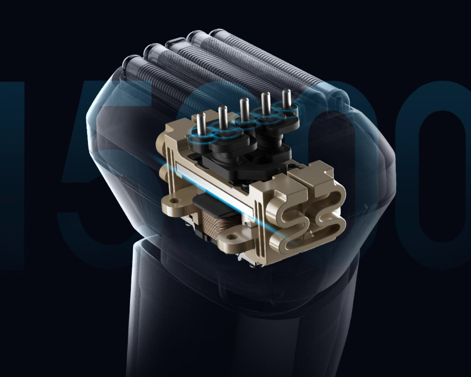 В движения лезвия приводятся линейным электродвигателем с магнитной подвеской, способным обеспечить скорость колебаний до 15 000 об/мин. И несмотря на заявленное отсутствие раздражающего звука, машинка довольно сильно шумит на диапазоне высоких частот. Зато, благодаря столь большим оборотам во время очистки в воде внутри лезвий создаются кавитационные пузырьки воздуха, которые легко очищают отверстия в сетках, удаляя грязь и мусор.