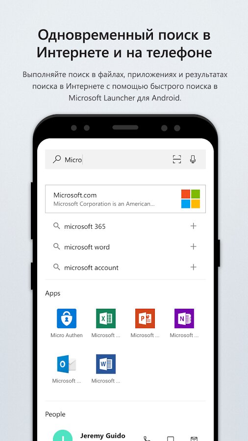 - Одновременный поиск в Интернете и на телефоне.Выполняйте поиск в Интернете, а также в своих файлах, приложениях, документах, сообщениях и результатах поиска в Интернете с помощью универсальной панели поиска Microsoft Launcher.
