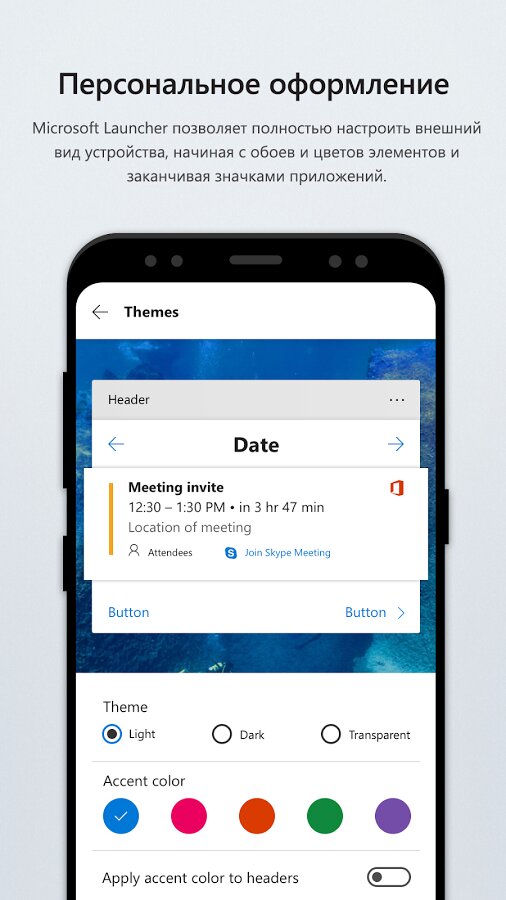 Microsoft Launcher — настройте индивидуальный внешний вид своего устройства с помощью стильных обоев, тем, пакетов значков и многих других возможностей. Получите доступ к календарю, документам и последним действиям в персональном канале, используя учетную запись Майкрософт либо рабочую или учебную учетную запись. Вы даже сможете открывать фотографии, документы и веб-страницы на компьютере с Windows и работать с ними на всех своих устройствах.