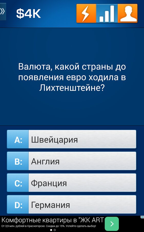 Миллионер — 15 вопросов, 4 варианта ответа, 4 несгораемых суммы, 4 подсказки и 2000000 главный приз.