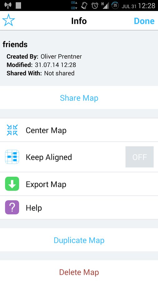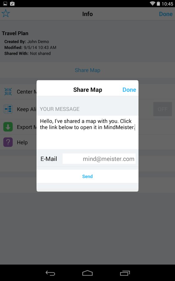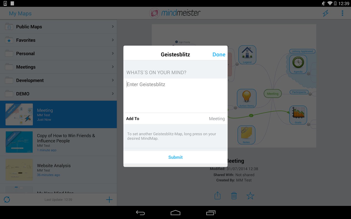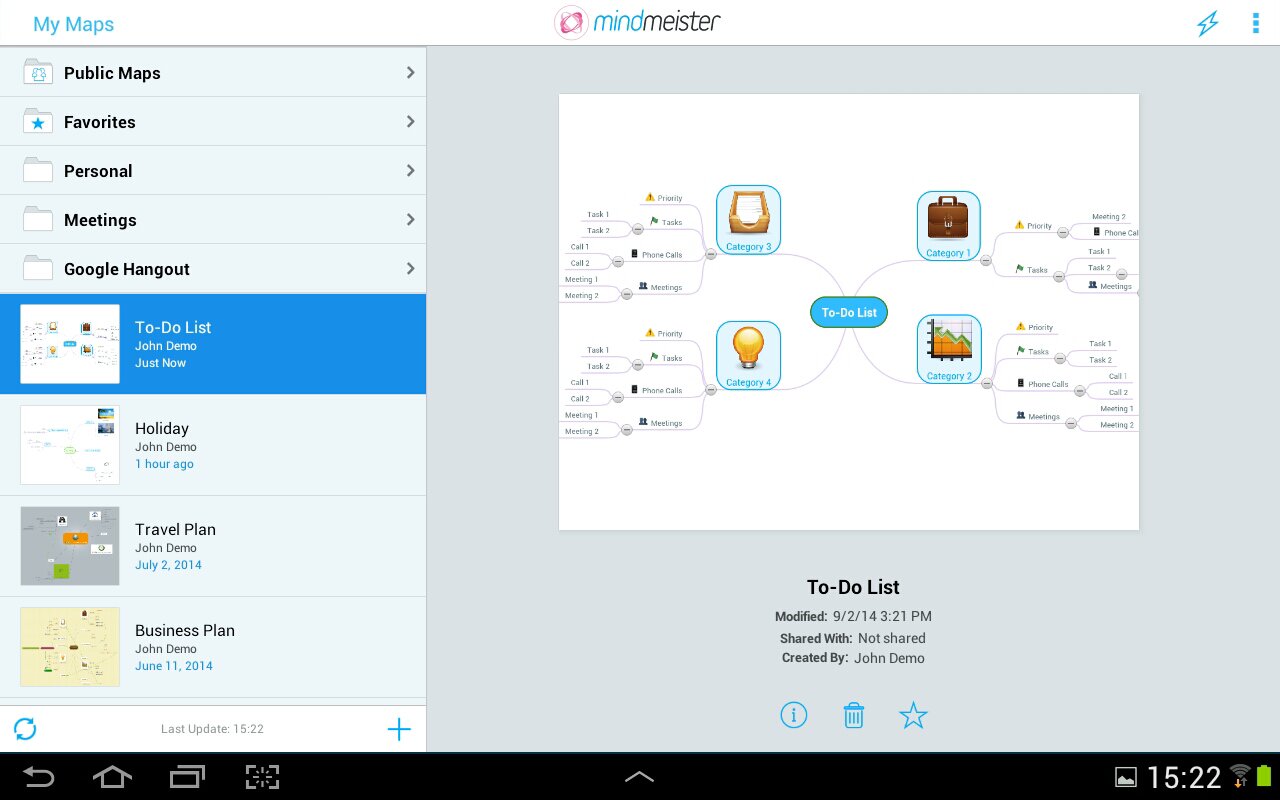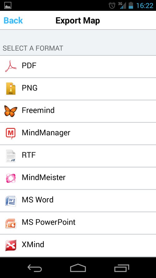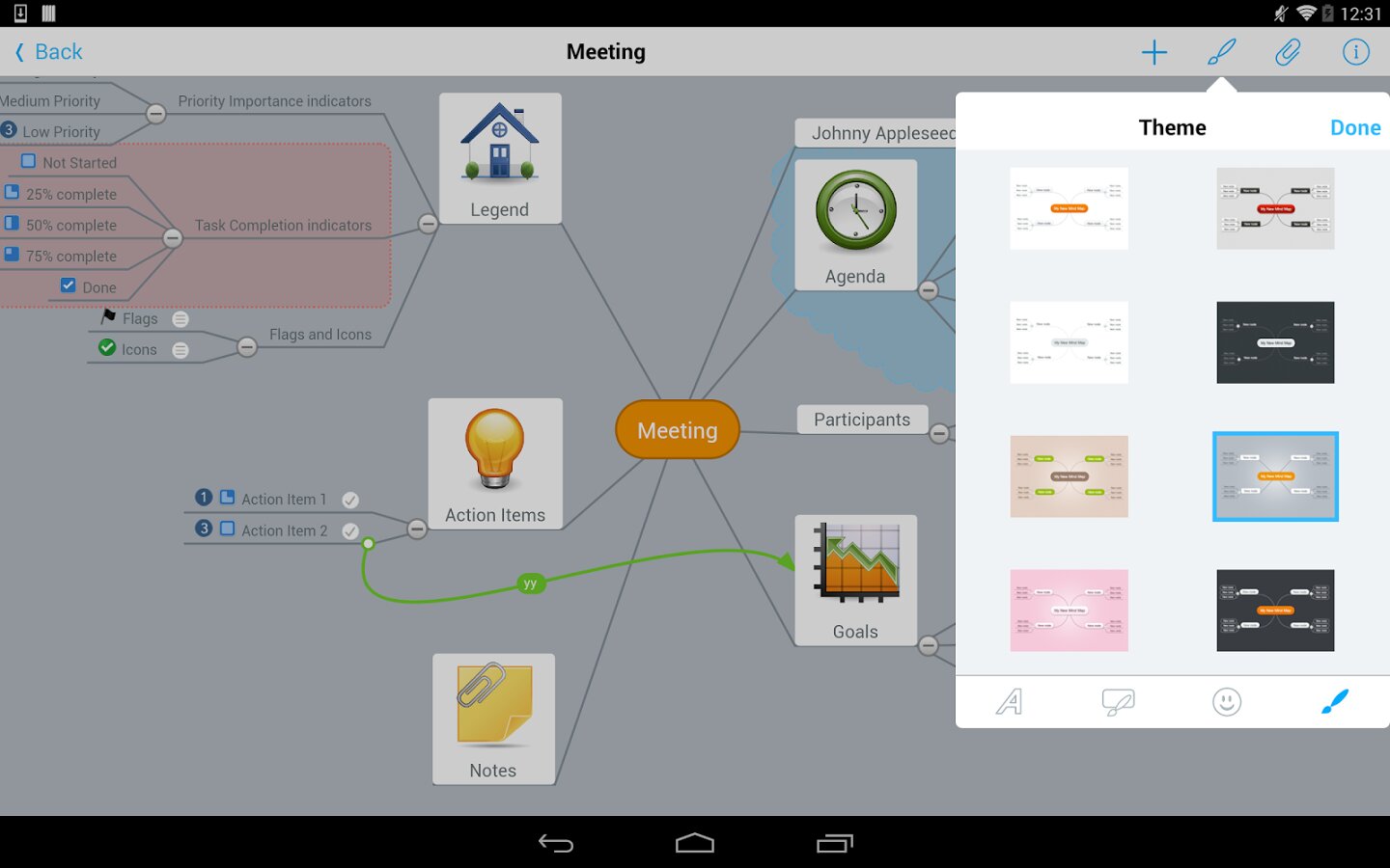 MindMeister — программа позволяет создавать неограниченное количество карт, систематизируя их при помощи папок. У нового элемента схемы можно задать множество параметров: формат шрифта, цвет фона, иконку и границы. Также есть возможность создавать связи между узлами и делать к ним пояснительные записки. Для приближения работает pinch-to-zoom. Объекты можно перемещать и менять местами, создавая любые логические построения.