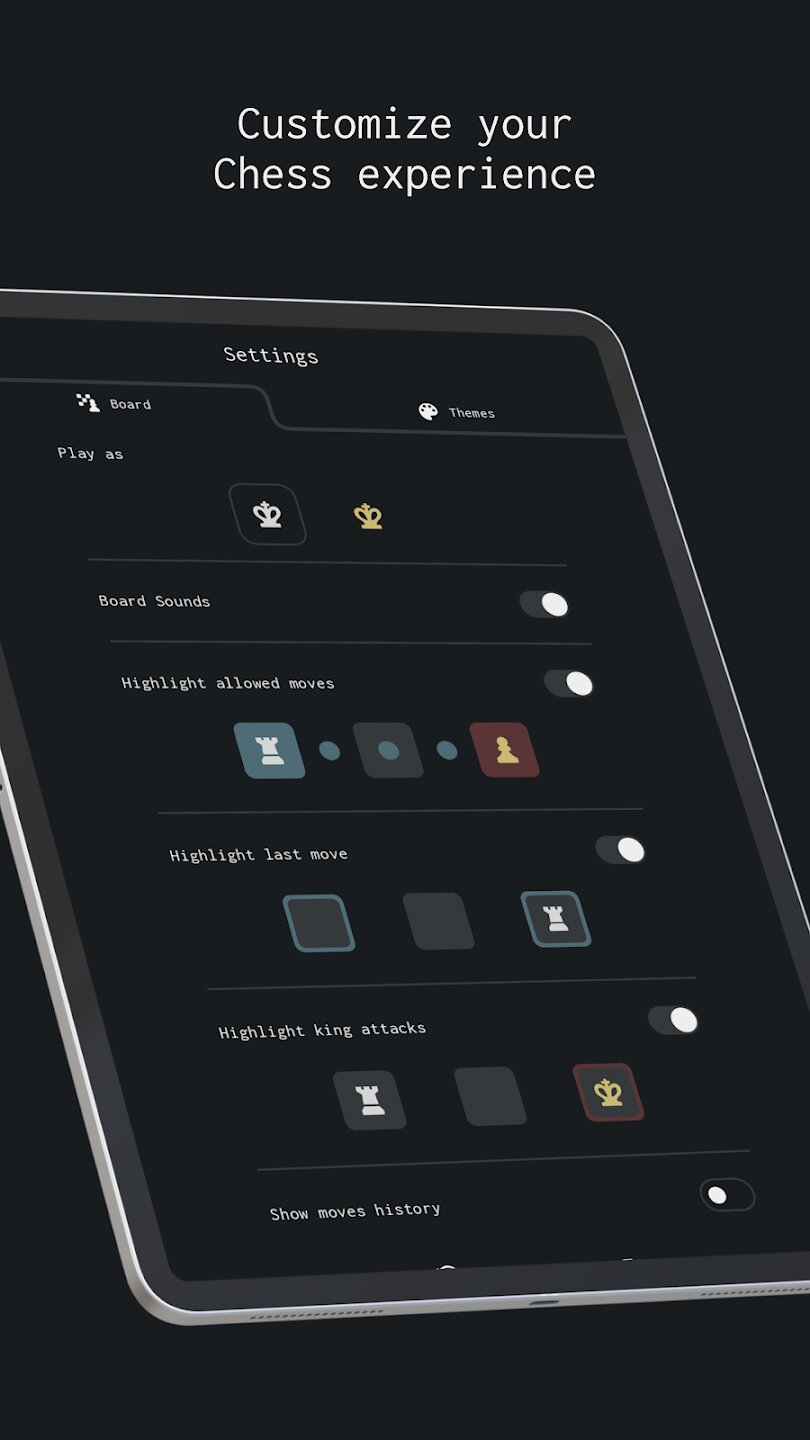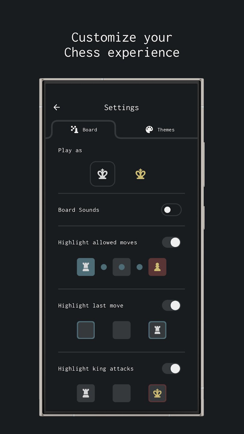Игра предлагает несколько способов играть и совершенствоваться. Вызовите друга на случайную партию в режиме для двух игроков или проверьте свои способности в борьбе с ИИ с десятью различными уровнями сложности. Для тех, кто любит решать тактические головоломки, увлекательный раздел шахматных головоломок предлагает идеальный способ тренировать свой мозг. Вы также можете настроить внешний вид своей доски с помощью различных премиальных цветовых тем, а полезная функция отмены действий обеспечивает более плавный процесс обучения, когда вам нужно переосмыслить ход.