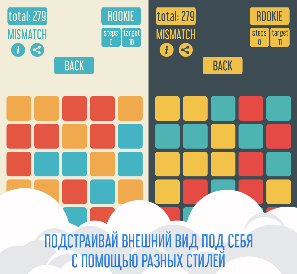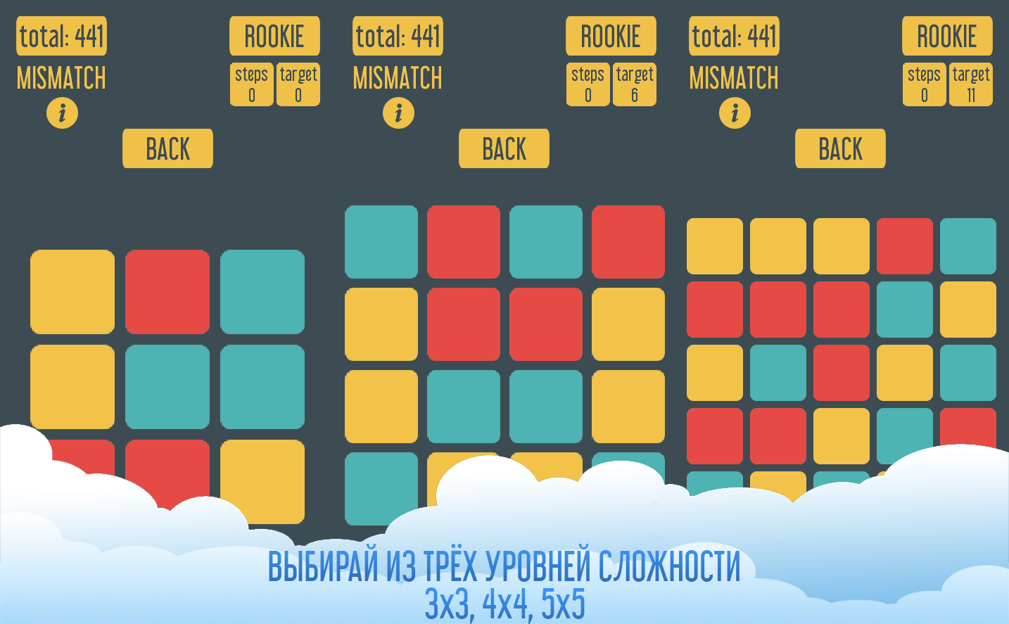 Цель игры – расставить кубики так, что-бы от каждого индивидуального кубика в стороны вверх. вниз. влево и вправо, не было кубиков одинакового цвета.