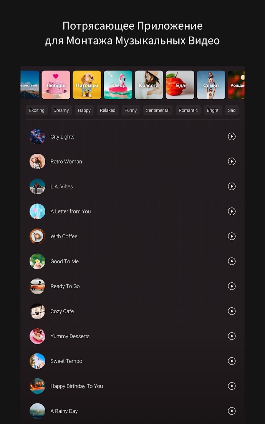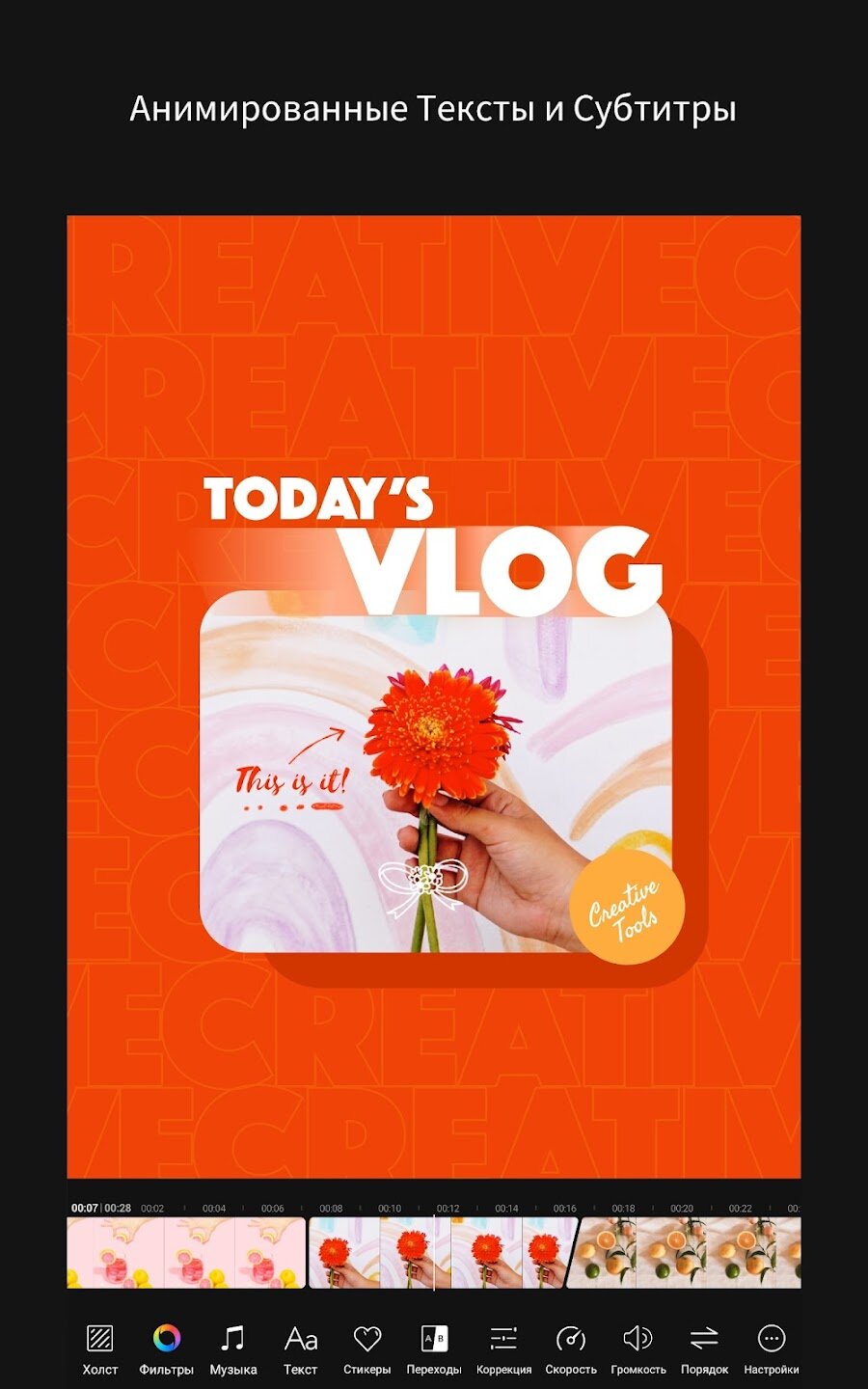 - Поддержка добавления музыки, переходов и динамических фонов.