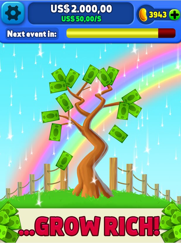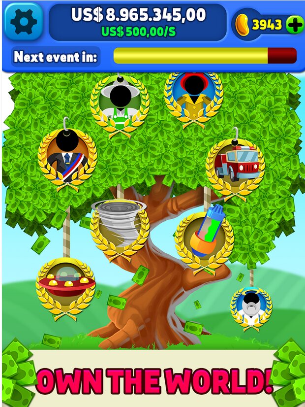 - Нанимайте САДОВНИКОВ, которые будут ухаживать за вашим денежным деревом и помогать вам в сборе столь приятного денежного урожая. Привлекайте детей, лам и даже зовите на помощь президента, если потребуется. Узнайте, на кого еще вы сможете рассчитывать! Покупайте новый ИНВЕНТАРЬ для роста доходов и БОНУСЫ для ускорения процесса! Насосы, поливочные установки, пожарные машины, счастливые штаны и амулеты на удачу, генераторы пришельцев и многое другое. Пригодится всё!