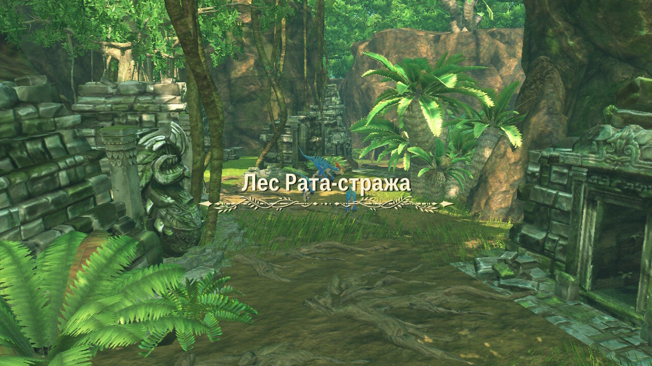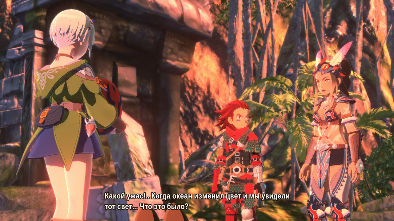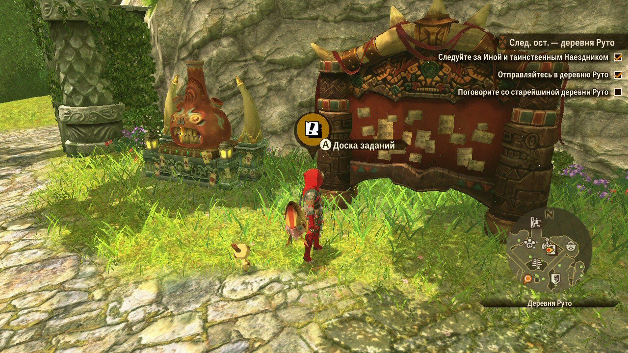 Далее начинается сюжетная кат-сцена, в которой выяснятся, что наш герой принадлежит к племени защитников монстров. Да еще и не простой простолюдин, а внук великого вождя и мастера-наездника, известного по первой части Monster Hunter Stories, именуемого Рыжим. Об этом довольно часто будут напоминать нам в диалогах. Полагаю, разработчики решили сделать это основным мотиватором стать сильнее для игрока, дабы перерасти тень, отбрасываемую заслугами предшественников.