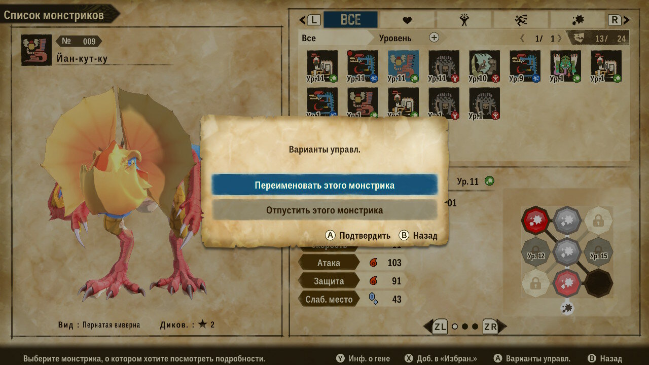 У игрока доступно пять ячеек для компаньонов, между которыми можно переключаться в любой момент. Чтобы получить сильного монстрика с хорошими и универсальными боевыми умениями, игра предлагает возможность скрещивания. Получение этакого гибрида происходит слиянием одного умения животного к другому, при этом первый монстрик исчезает из коллекции. Вот такая суровая селекция в Monster Hunter Stories 2.