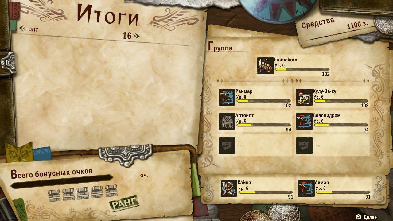 По окончании боя присваивается рейтинг, зависящий от результативности выбранной тактики и скорости победы. Чем выше рейтинг, тем богаче награда и опыт, который равномерно распределяется между всеми членами отряда.