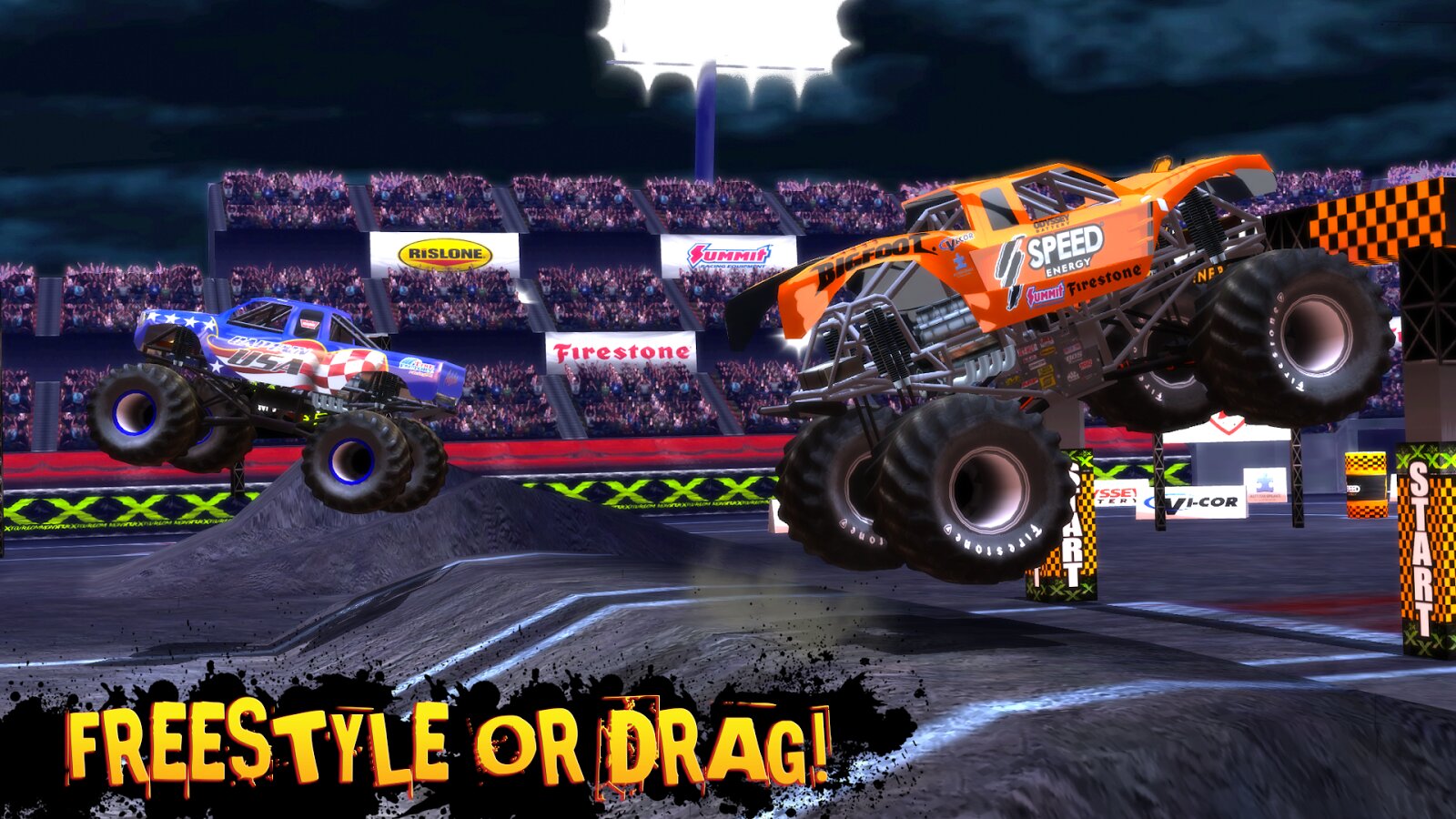 - ГРУЗОВИК. Поуправляйте более чем 60 лицензированными грузовиками-монстрами, такими как BIGFOOT, USA-1, Boogey Van, Outback Thunda, Virginia Beast, Traxxas RC, и повысьте выход выхлопных газов, потребление двигателя, подвеску и трансмиссию двигателя, чтобы не отставать от конкурентов.