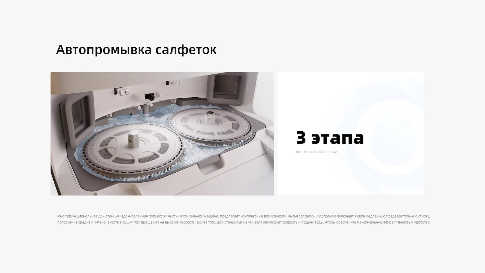 Кроме того, вращаются они со скоростью 200 оборотов в минуту в противоположных направлениях, что положительно сказывается на эффективности удаления въевшихся пятен и существенных загрязнений. А когда роботу необходимо выполнить сухую уборку коврового покрытия, он автоматически поднимает швабры на высоту 10 мм, чтобы влажные салфетки не намочили ворс. При этом в фирменном мобильном приложении есть гибкая система настроек влажной уборки, позволяющая подобрать оптимальные параметры под требования пользователя. Да и базовая станция с системой сушки швабр тоже имеется — это удобно.