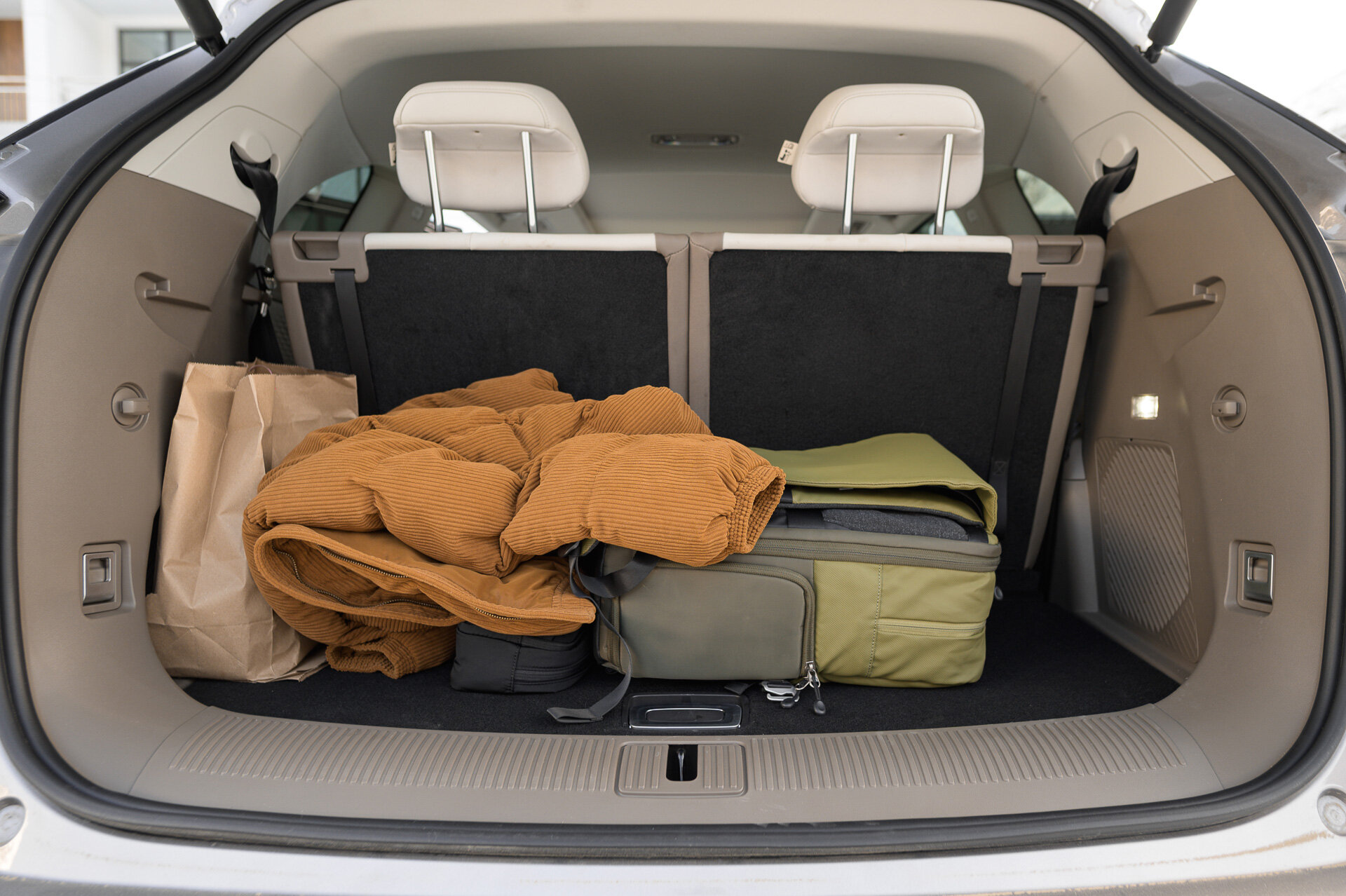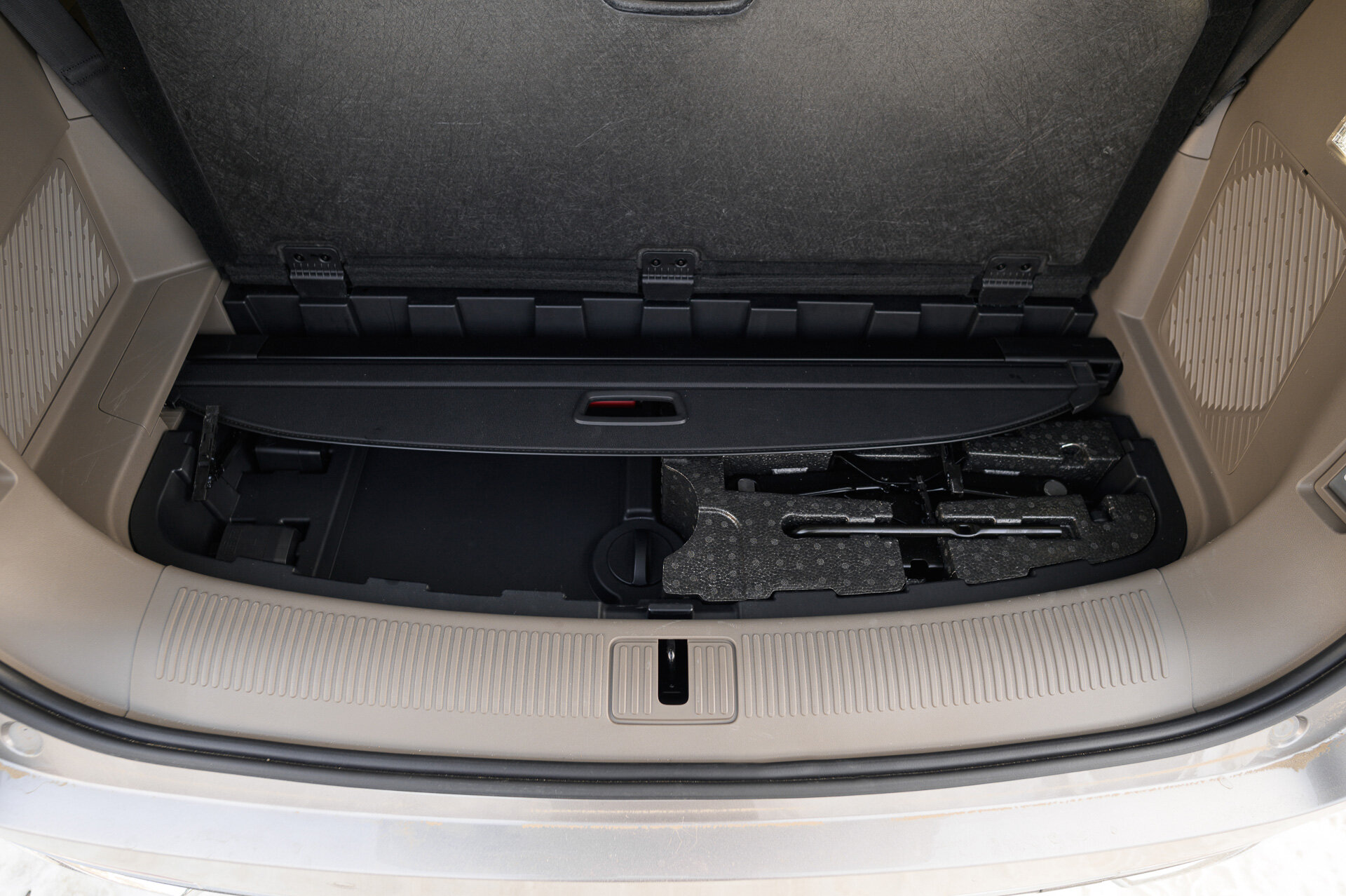 Ну а я перемещаюсь, да-да, в багажник. На фото вы видите вариант с разложенным третьим рядом. Забегая вперёд, скажу, что у третьего ряда регулируется наклон спинки, так что объём багажника даже в таком виде будет варьироваться. Два-три чемодана влезут без проблем, по документам 332 литра объёма. Если сложить все сиденья, получите 2093 литра.