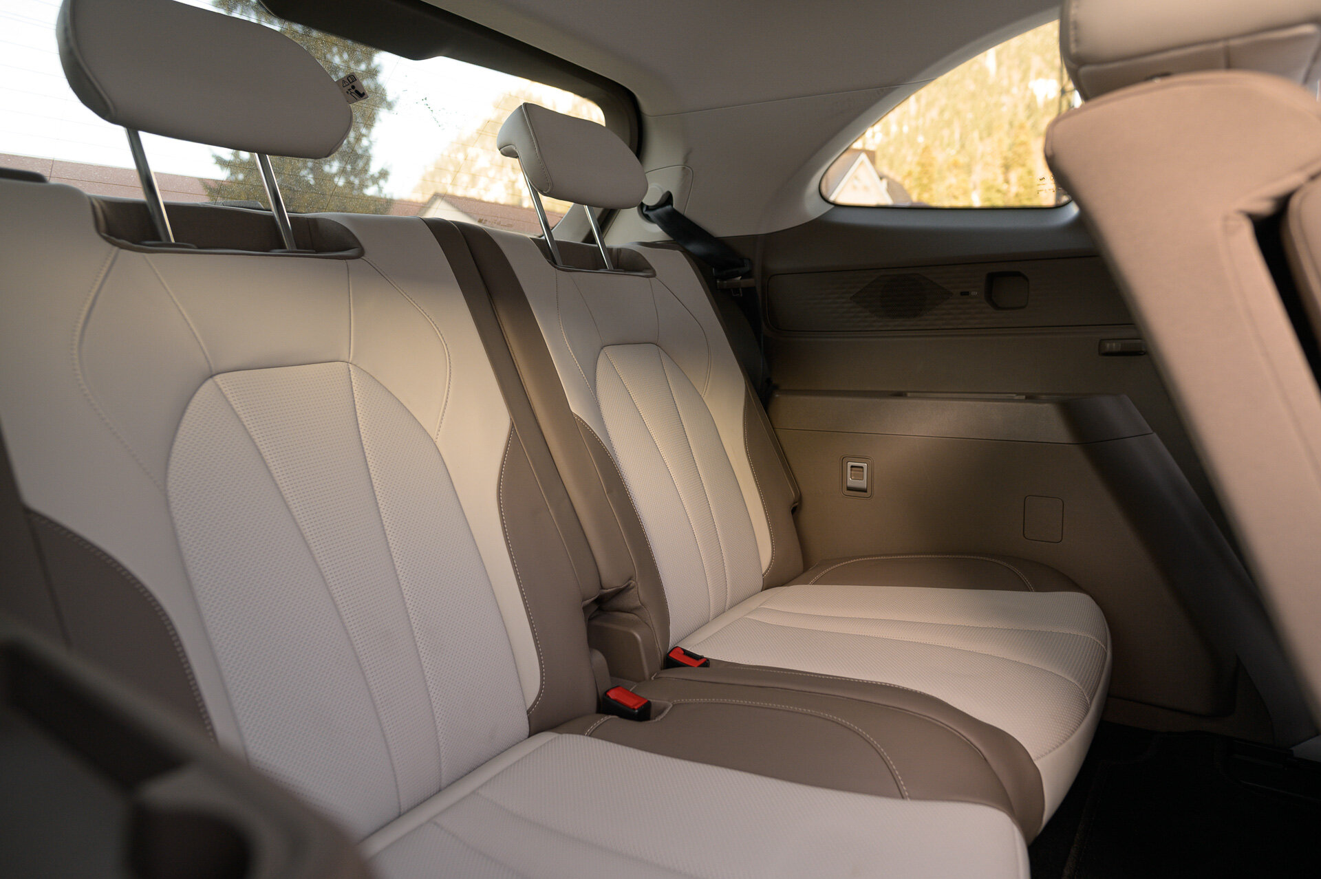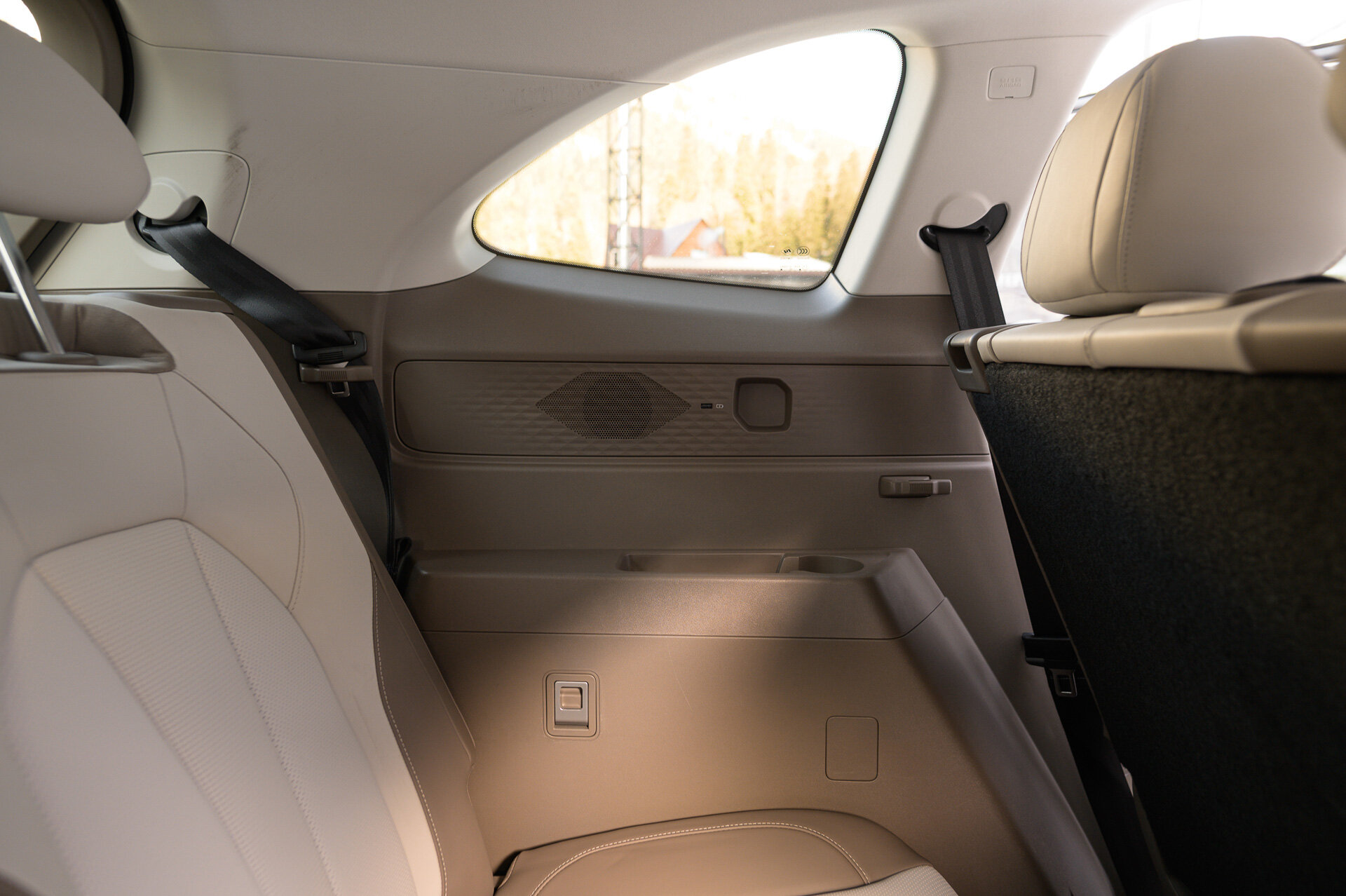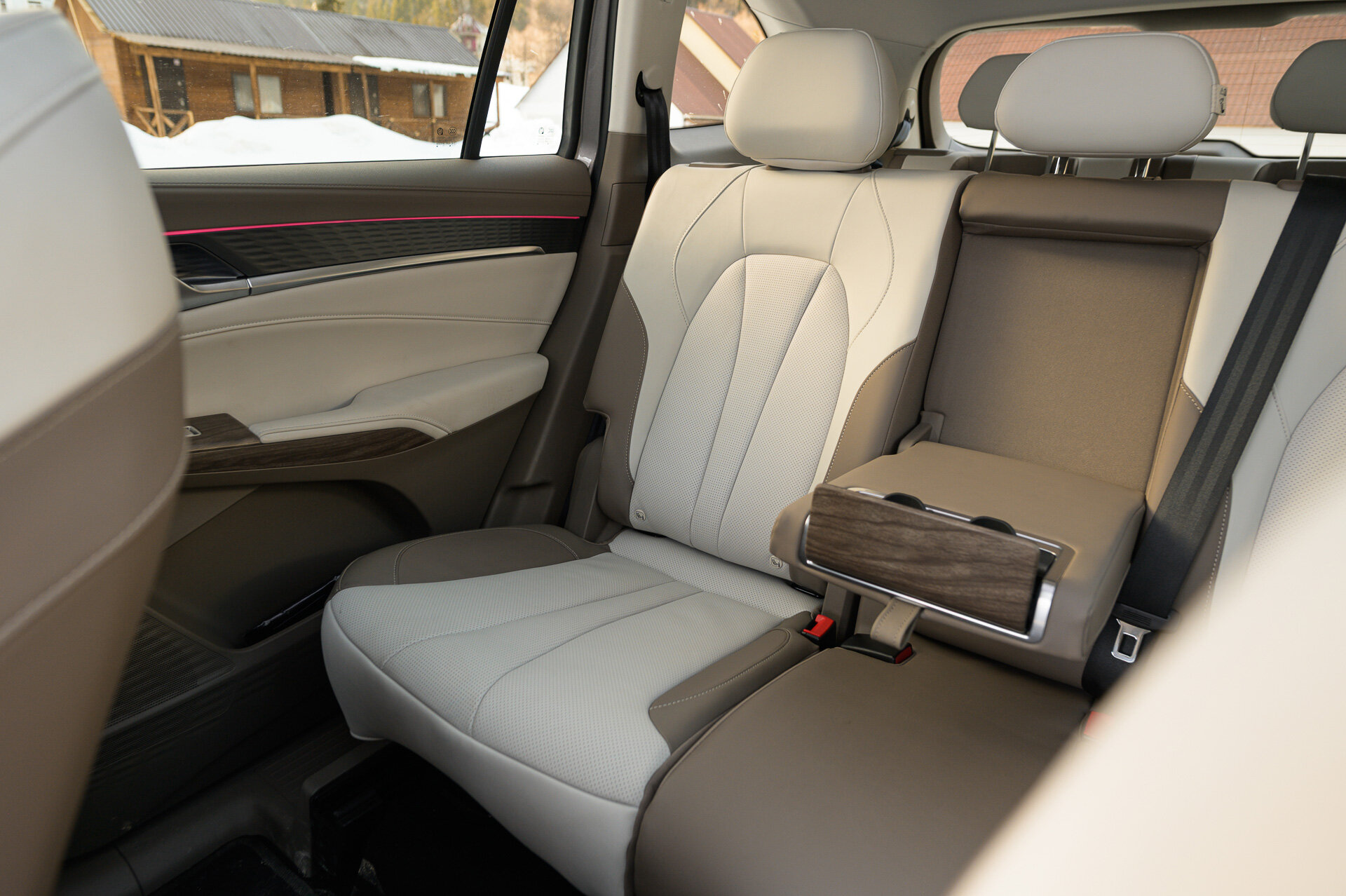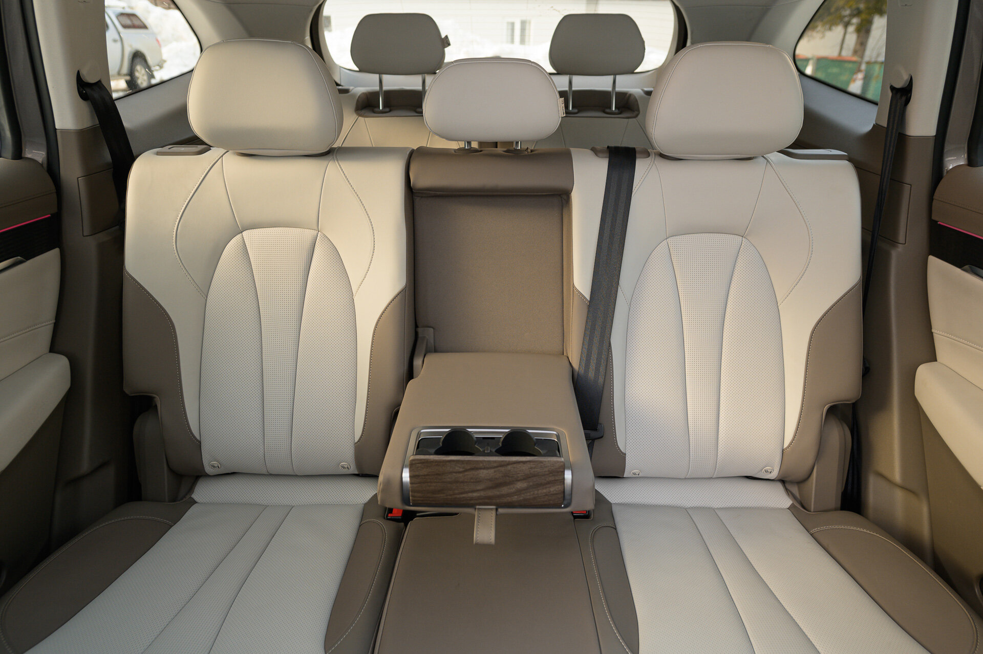 Заблаговременно подвинув немного второй ряд вперёд (уже руками), пролезаю на галёрку. Здесь без сюрпризов и главный аспект — весьма высокий уровень пола, так что коленки будут высоко. Если дорога у вас планируется весьма монотонная, то сзади можно без особого дискомфорта провести несколько часов. Есть своя розетка USB-A, подлокотники и даже дефлекторы обдува на потолке. А вот кофеёк поставить особо некуда, те пазы, что имеются, не обещают надёжной фиксации ароматного напитка.