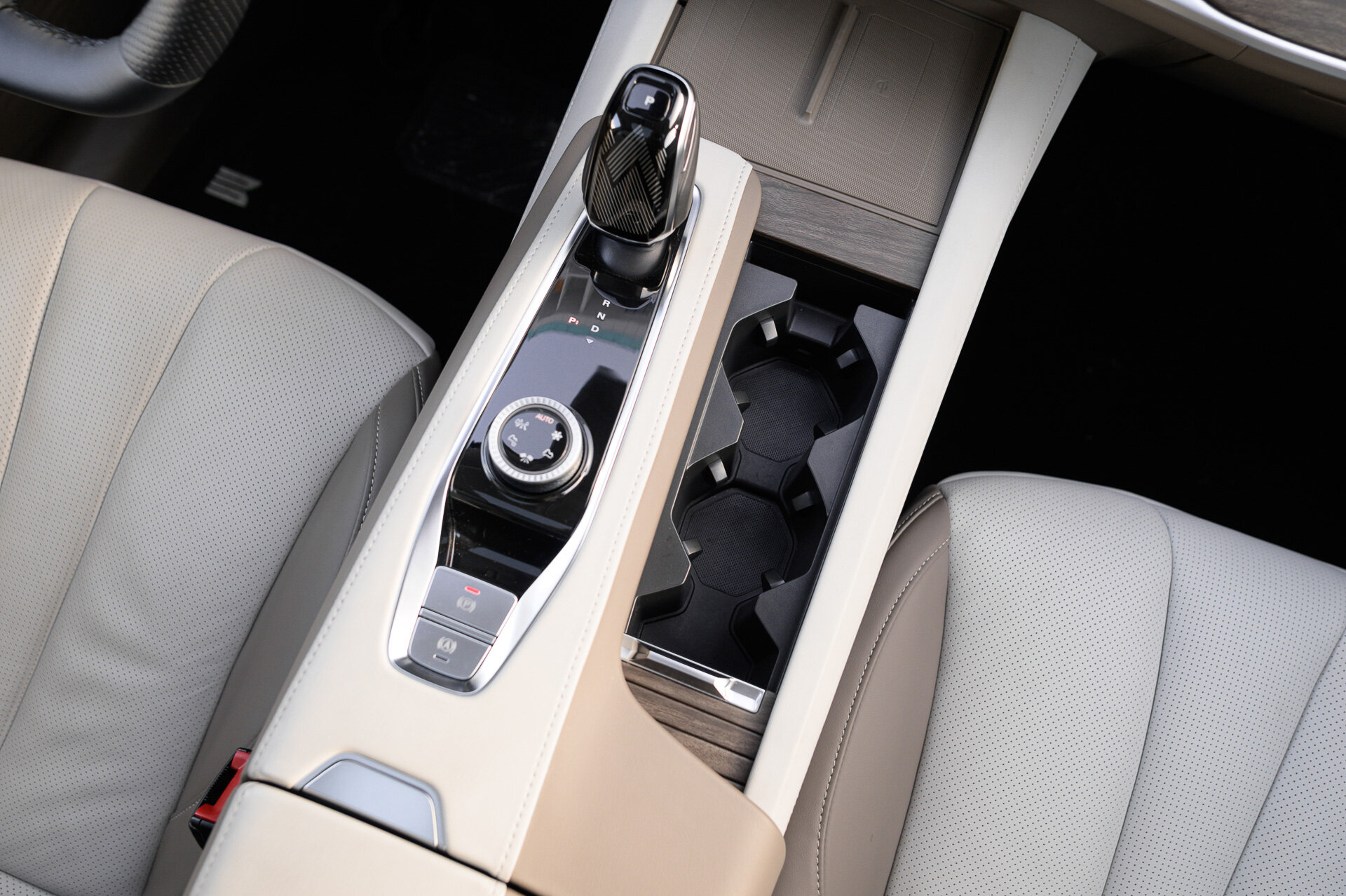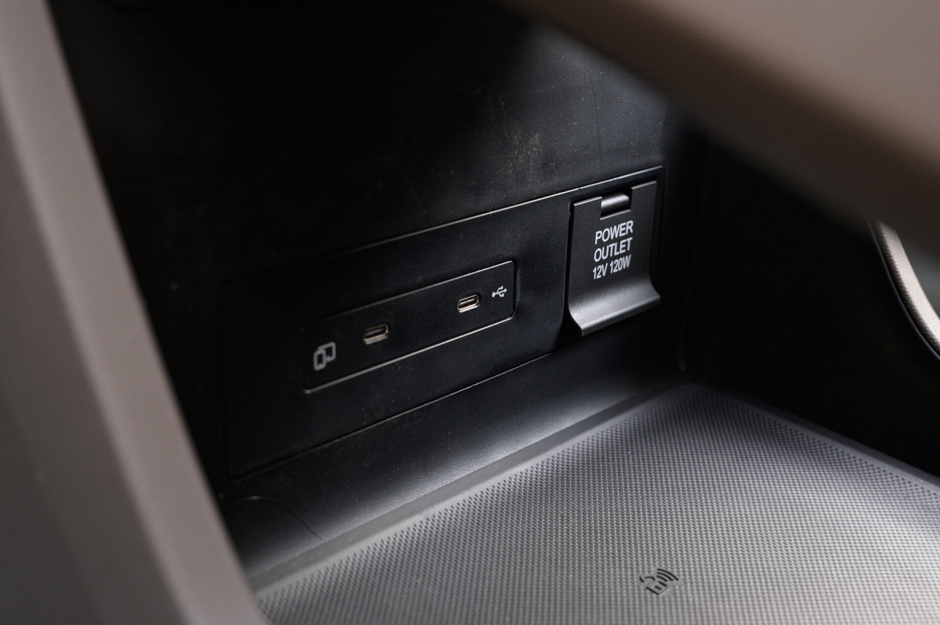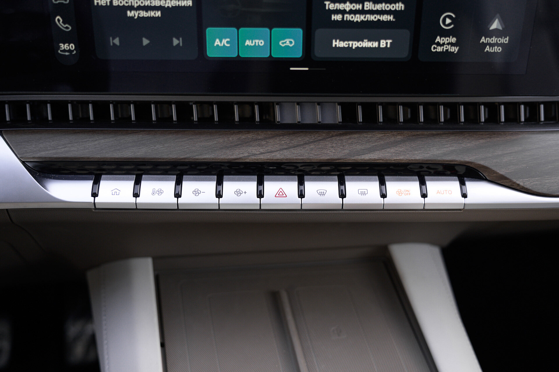 Во-первых, фиксаторы тары переехали подальше от разъёмов (те и вовсе на нижнем ярусе) и теперь прячутся под сдвижной шторкой. Во-вторых, появилась зарядка смартфона, правда, только одного и со стороны пассажира.