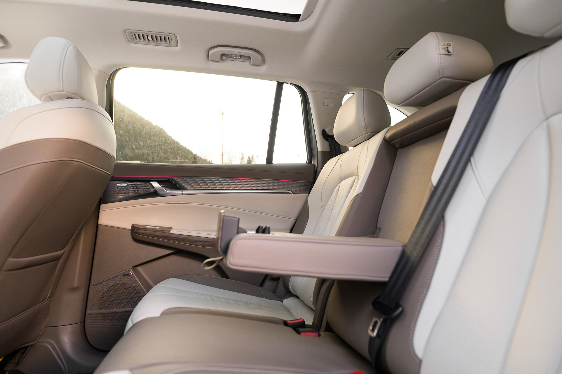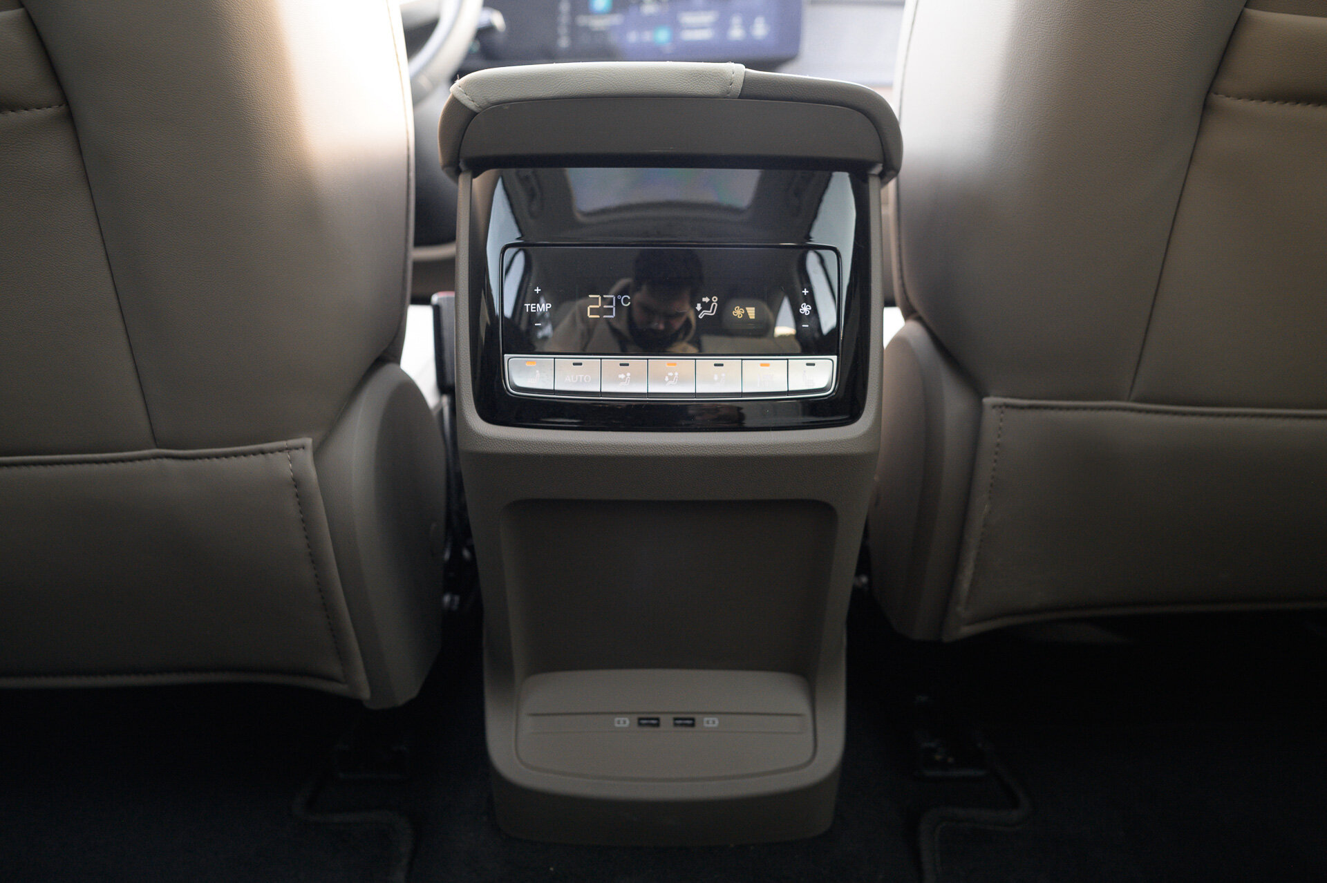 Именно на втором ряду можно насладиться видами панорамной крыши, но что более важно, воспользоваться своим блоком управления климатом. Эти настройки распространятся и на третий ряд. Как и у М70, для зарядки гаджетов только два USB-A, и оба почти на полу.