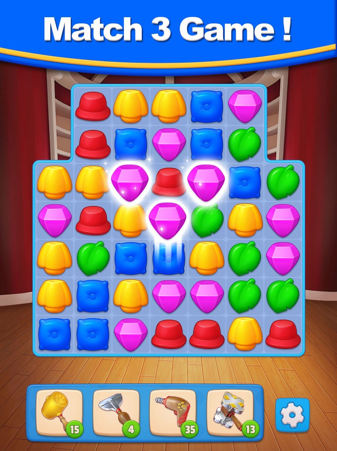 - Совмещение геймплея «три в ряд» с ремонтом и дизайном