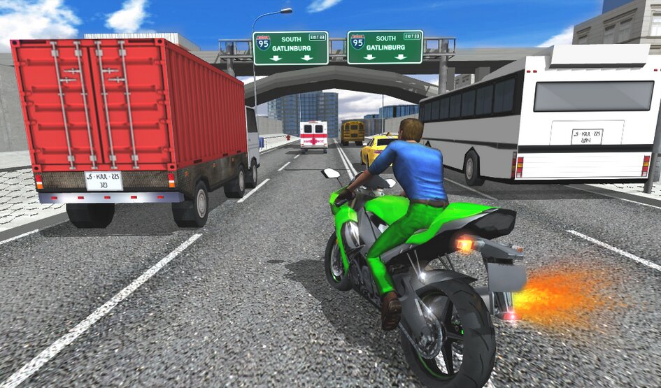 Садитесь на свой мотоцикл и промчитесь по городу. Уклоняйтесь от движущихся автомобилей при езде на сумасшедшей скорости, зарабатывайте очки и покупайте лучшие мотоциклы в этой гоночной игре.