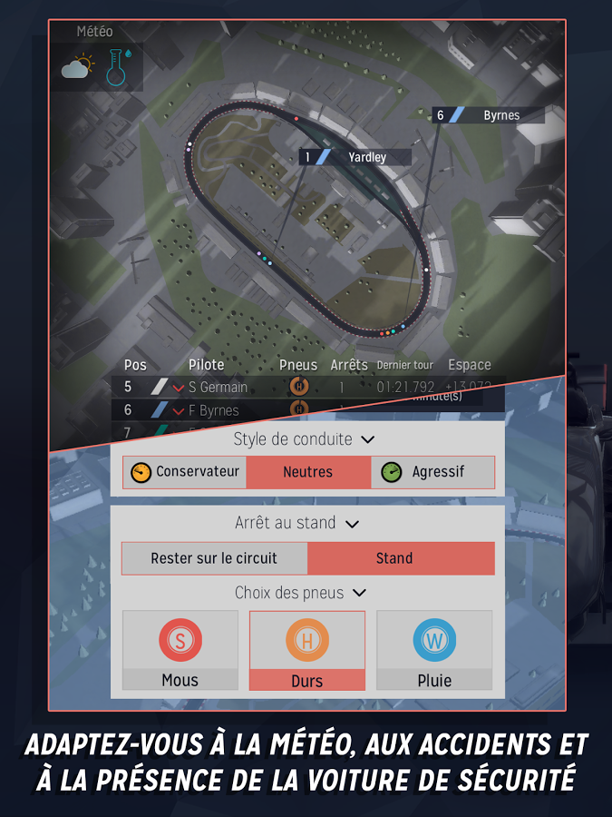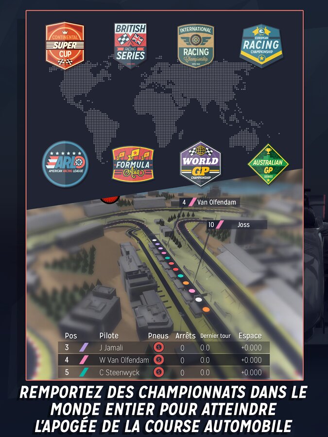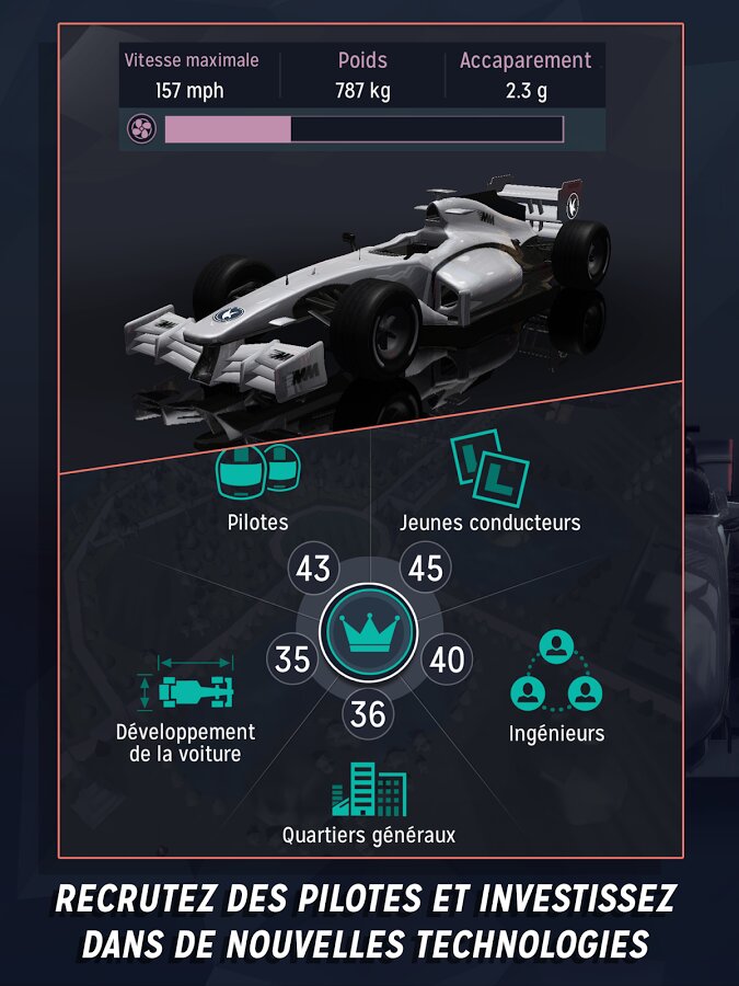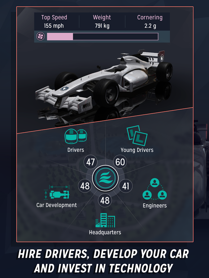 - Создайте лучшую команду из гонщиков, менеджеров, механиков и конструкторов.