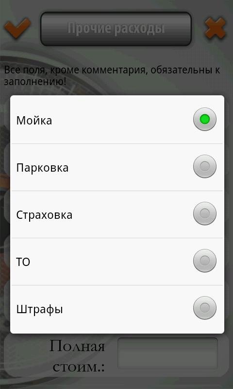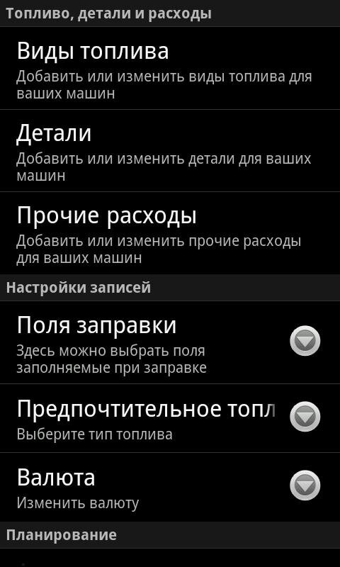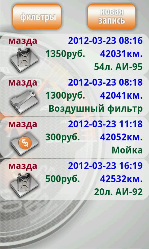 - Запись и просмотр расходов на автомобиль (топливо, замена масла и сервис).