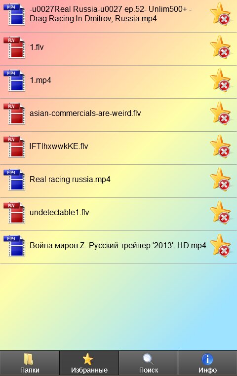 FLV HD MP4 Видео Плеер 2.1.4 для Android — Быстрый, стабильный и функциональный видео плеер для проигрывания всех FLV файлов (так же .f4v, .f4p, .f4a, .f4b), включая HD и большинства MP4 файлов. Не требуется установка Flash или Air. Смотрите ваши видео как с SD-карты, так и внутренней памяти устройства. Отмечайте ваши любимые видео и создавайте свой персональный плейлист из них. Можете искать видео по названию видео в вашем устройстве.