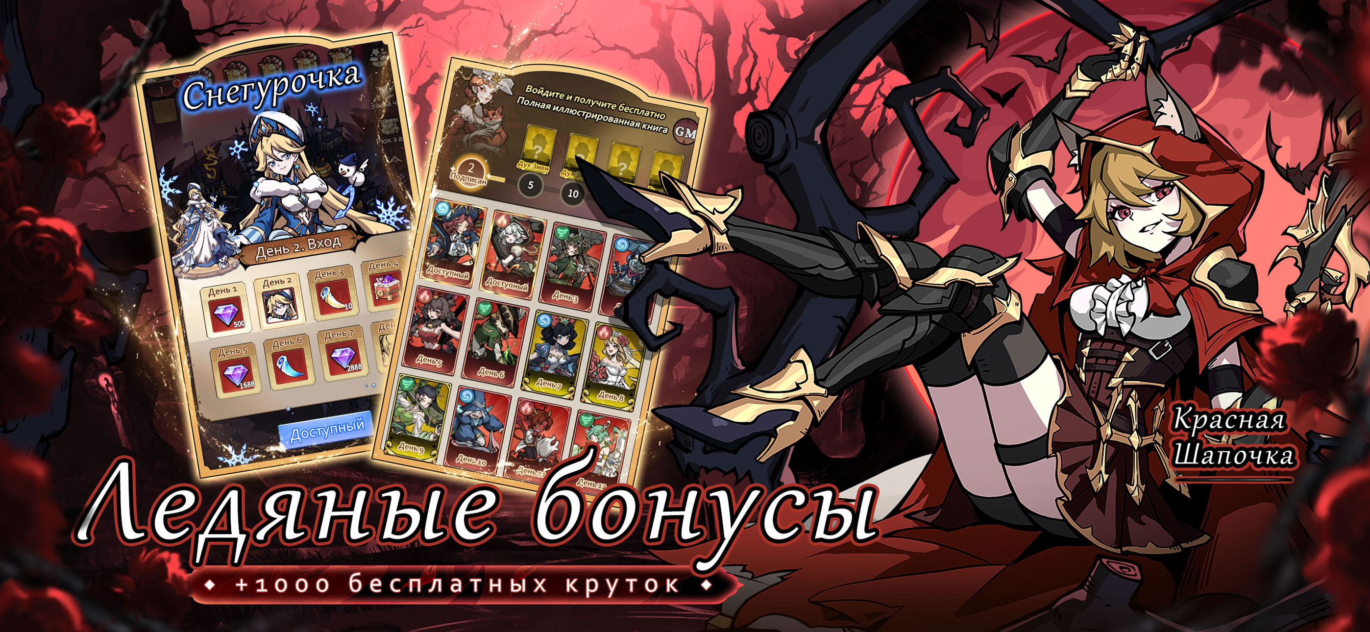 - Награды за вход в игру, включая эксклюзивного персонажа Снегурочку и 1000 бесплатных призывов.