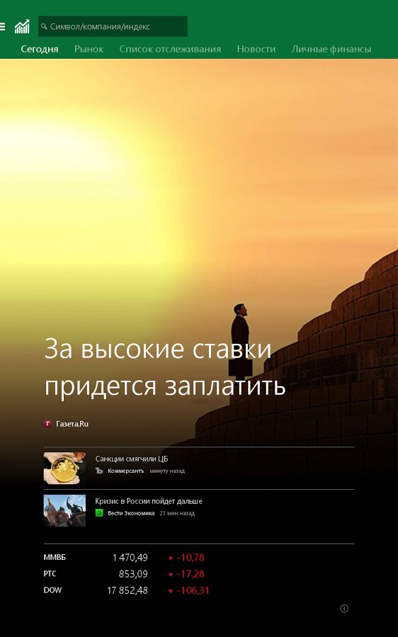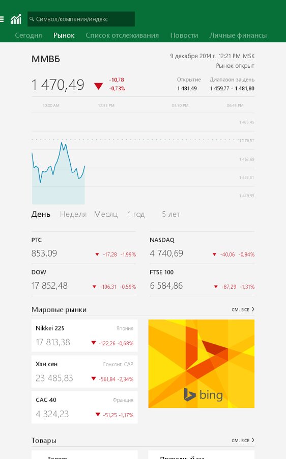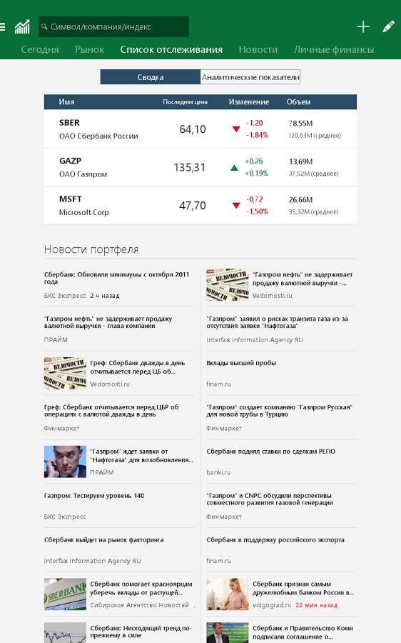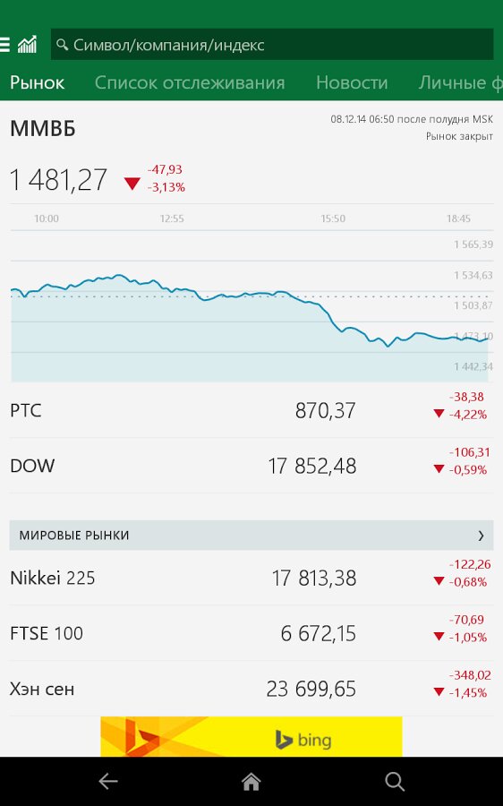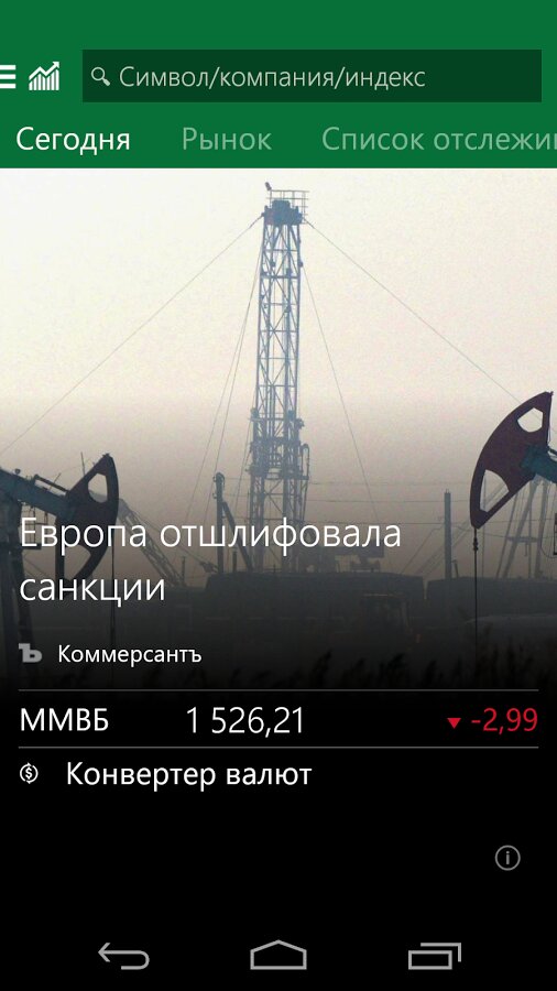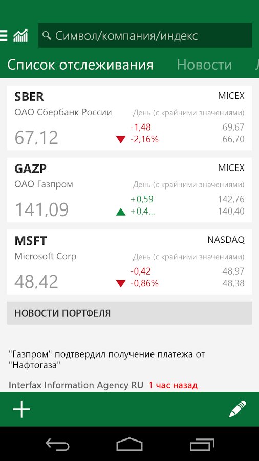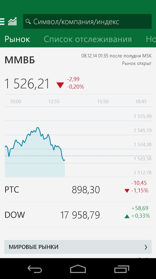 Отслеживайте основные индексы по всему миру, включая MICEX, RTSI, NASDAQ, NYSE, Dow Jones, S&P 500, DAX, FTSE 100, NIKKEI 225 и многие другие. Просматривайте обменные курсы и цены на сырьевые товары. - ПЕРСОНАЛИЗИРОВАННЫЙ СПИСОК ОТСЛЕЖИВАНИЯ