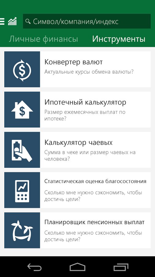 Оптимально распоряжайтесь своими деньгами с помощью инструментов для финансов и бюджета, таких как ипотечный калькулятор, программа пересчета валют, калькулятор чаевых, программа оценки капитала и планировщик выхода на пенсию. - ДОСТУПНО ГДЕ УГОДНО