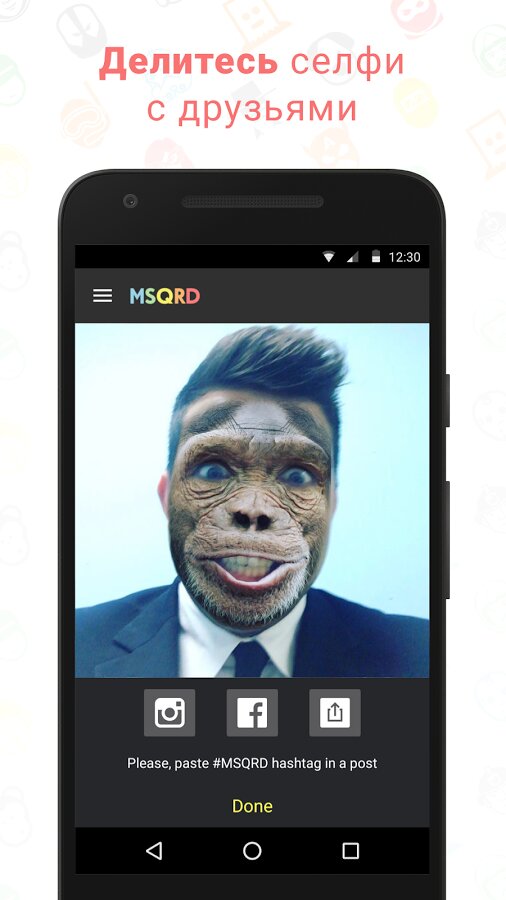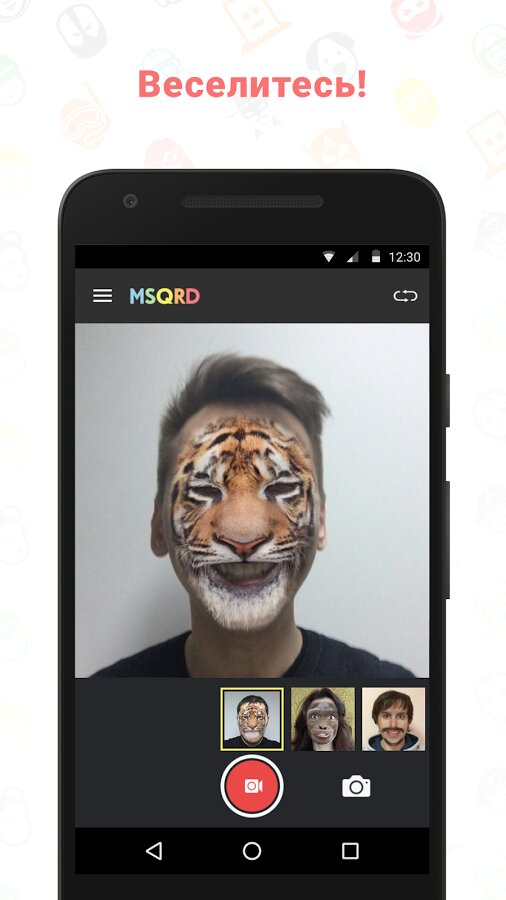 Делайте селфи с измененной внешностью, удивите друзей! MSQRD позволяет записывать видео-селфи с анимированными масками, менять образы и отправлять результат в любимые мессенджеры и социальные сети.