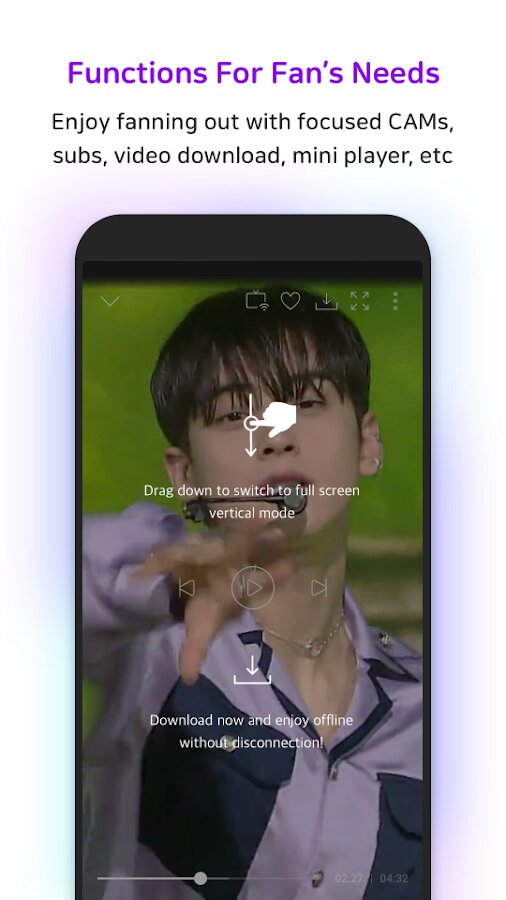- Доступ к последним музыкальным видео, выступлениям и закулисному контенту от лучших артистов Kpop.