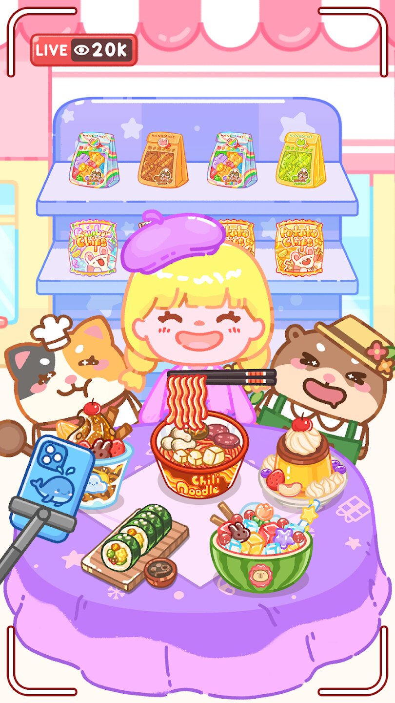 Mukbang ASMR Livestream Party приглашает вас стать следующей интернет-сенсацией. Начните свое путешествие с приготовления разнообразных вкусных блюд быстрого приготовления, от золотистого жареного цыпленка до кипящих кастрюль с острой лапшой. Смешивайте красочные газированные напитки и составляйте идеальные блюда, наслаждаясь при этом реалистичными звуками приготовления еды. Ваша цель — создать самые привлекательные блюда, которые покорит вашу будущую аудиторию и помогут вашему каналу расти.