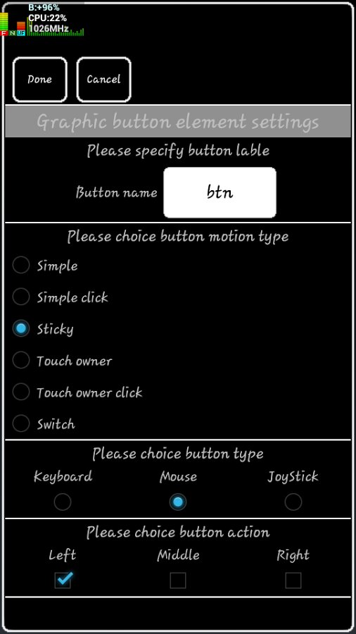 Изначально для пользователя доступны 3 типа устройств, “TouchPad”,“GamePad” и “Клавиатура”, далее пользователь может добавить другие типы устройств(“дополнительная клавиатура”, “ джойстик”, “пустое устройство”). Все устройства кроме клавиатуры, это готовые шаблоны созданные из пустого устройства в которое добавлены необходимые элементы. Пользователь по желанию может добавлять, передвигать, изменять размеры или удалять любые элементы с устройства. Для устройства “Клавиатура” возможность менять настройки, отключена.