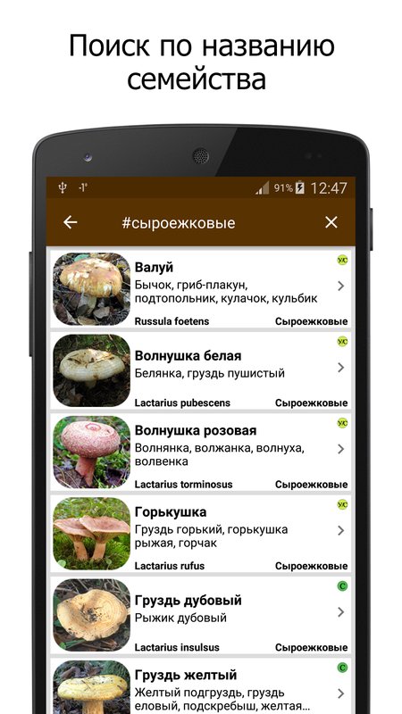 Приложение поддерживает поиск по названию гриба на русском и латинском языках, а также поиск по названию семейства, к которому принадлежит определенный вид грибов.