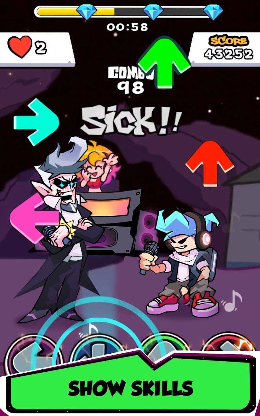 Основной игровой процесс следует классической ритмичной формуле: по экрану прокручиваются разноцветные стрелки, и вы должны нажимать на них в такт музыке, когда они попадают в целевую зону. Осваивайте паттерны на протяжении целых недель песен и часто обновляемых модификаций с участием разнообразных персонажей из различных популярных культур. Режим онлайн-сражений добавляет соревновательный элемент, позволяя вам бросать вызов другим игрокам в режиме реального времени, чтобы доказать, кто обладает лучшими навыками ритма. Благодаря простой механике и сложной кривой освоения, игра понравится как случайным игрокам, так и ветеранам ритм-игр.