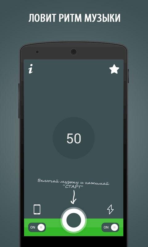 - Ловит ритм музыки (и любой другой звук) с помощью микрофона