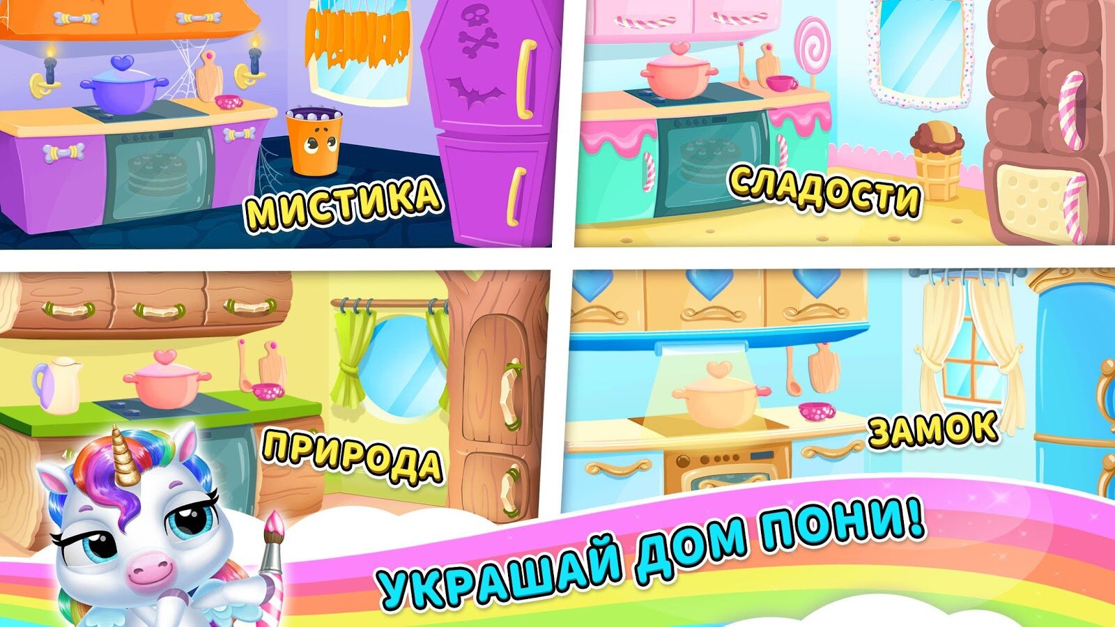 - УХАЖИВАЙ ЗА ЕДИНОРОГОМ! Твой домашний пони очень любит вкусно покушать! Отправляйся за покупками и накорми малыша вкусняшками. Столько разных блюд! Наряди своего радужного пони в веселые наряды и добавь украшений! Время принять ванну с пеной! А когда твой маленький единорог устанет, спой ему колыбельную и уложи спать.