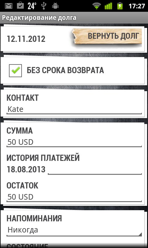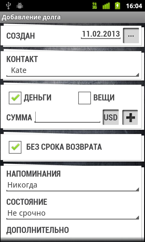 - Добавляйте денежные и вещевые долги (вы должны или вам должны).
