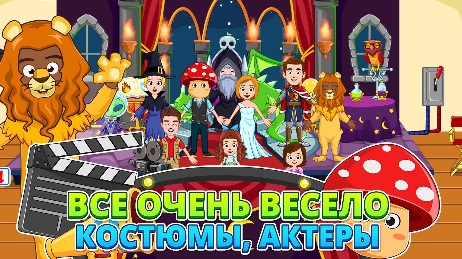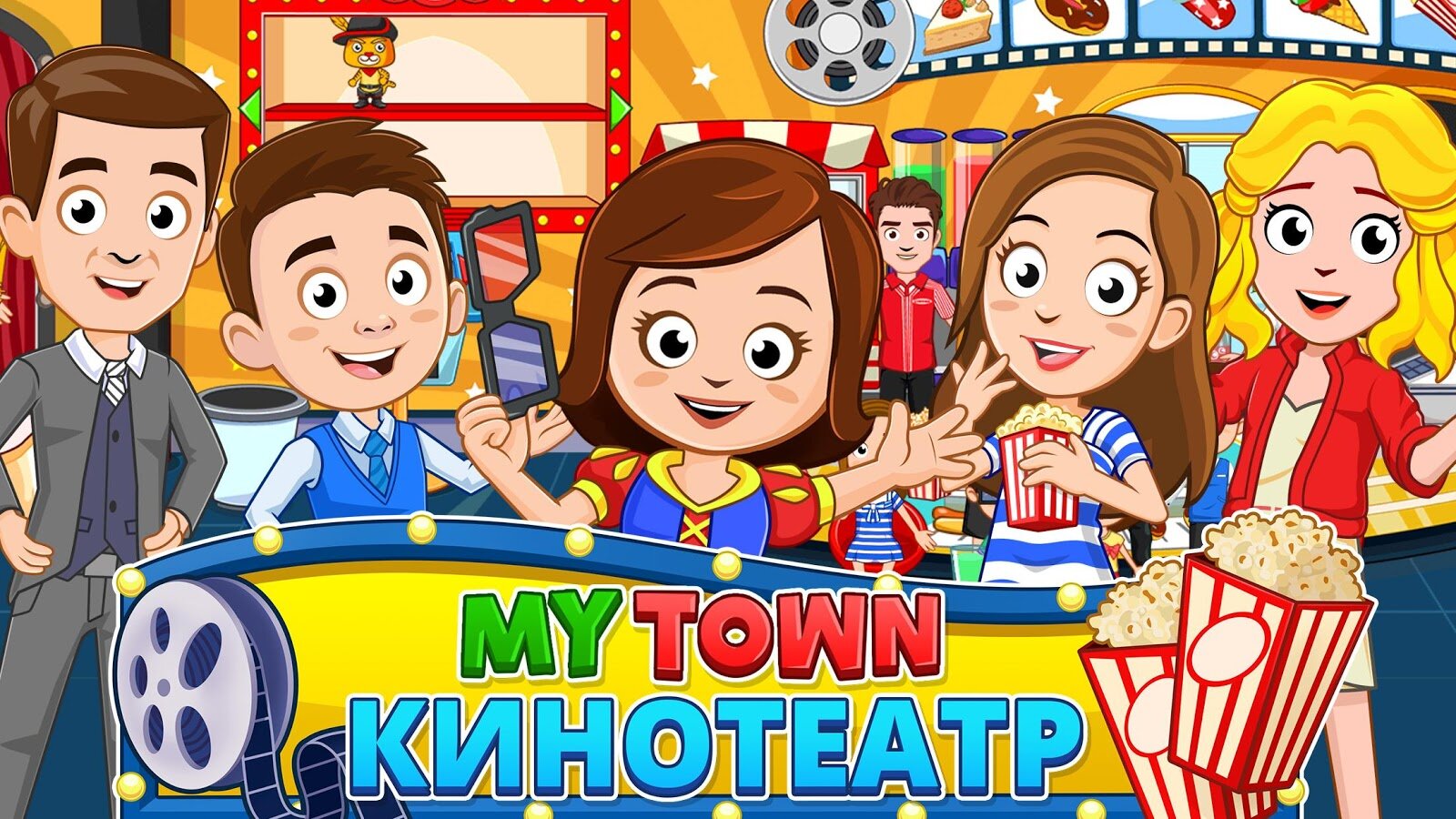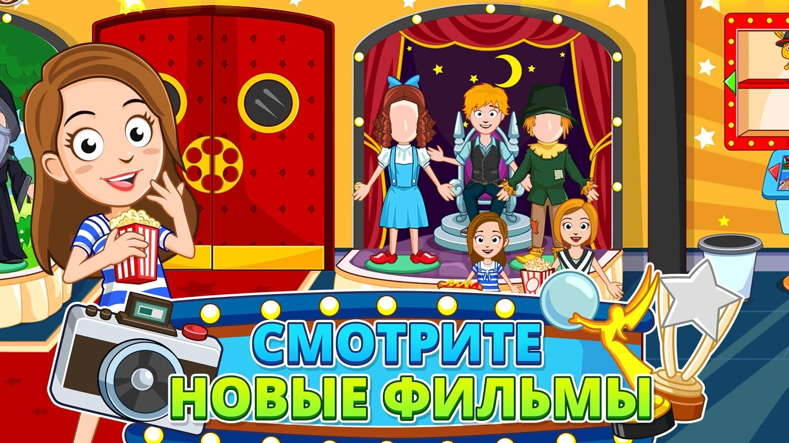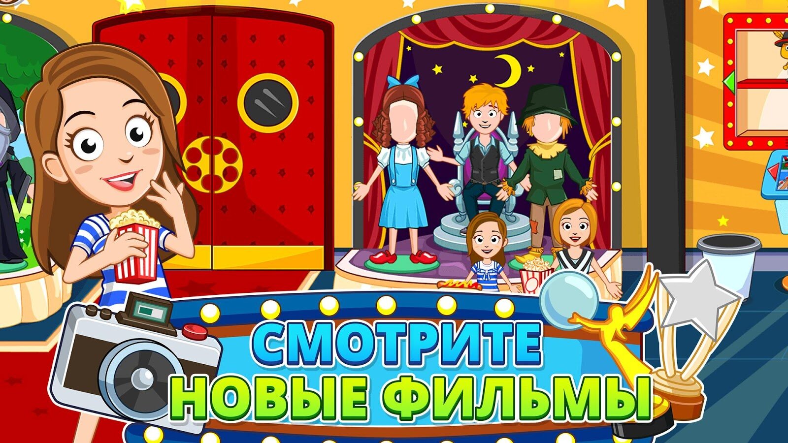 My Town Кинотеатр — сегодня в My Town ночь фильмов. Посмотрите 3 разных кинолент, станьте на время актером, перевоплотитесь в режиссера, играйте как волшебник из страны Оз или просто купите попкорн и пройдите наверх в кинозал. Исследуйте различные места и открывайте неожиданные сюрпризы.