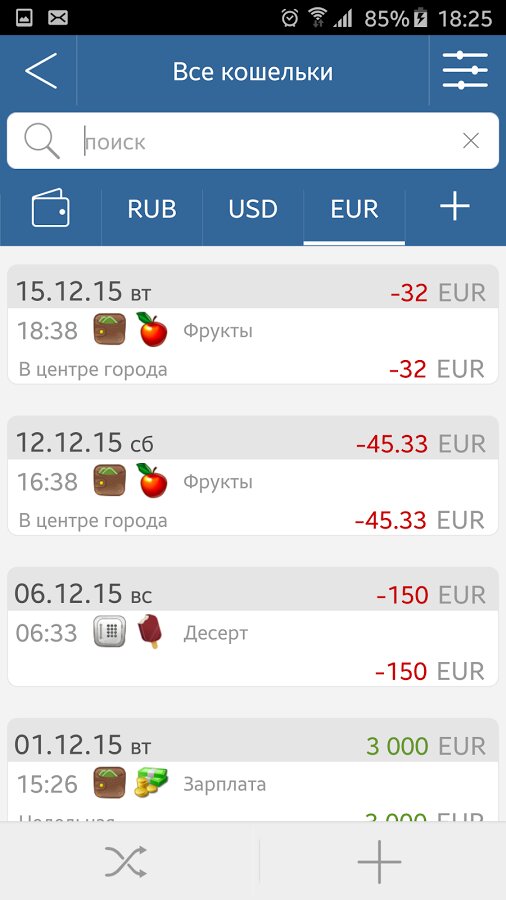 С ее помощью Вы сможете узнать сколько Вы тратите денег каждый день и на что они уходят в большем количестве. Вы сможете создавать различные кошельки и карточки для контроля остатка наличных, остатка на банковской карте, в сейфе или в копилке.