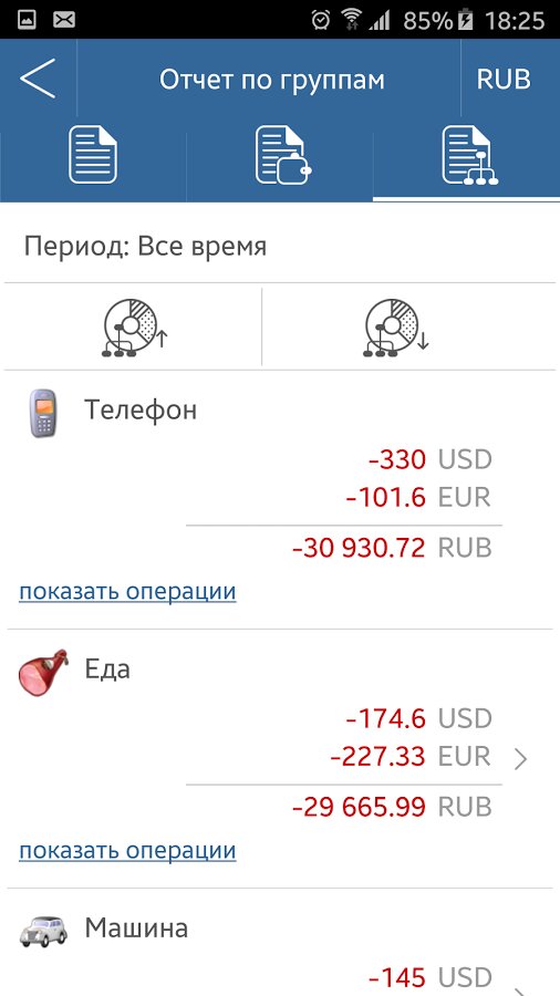 Вы можете создавать группы и подгруппы, с помощью которых можно узнать в какой области происходит наибольший уход или приход денежных средств. Так же Вы сможете просматривать различные графические отчеты о движении Ваших сбережений.