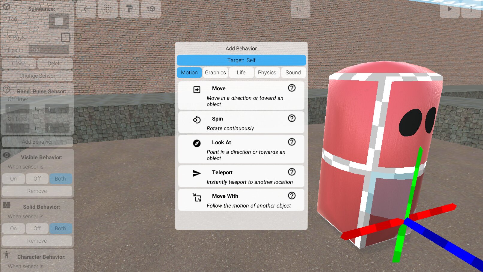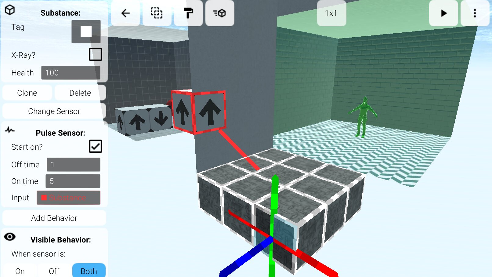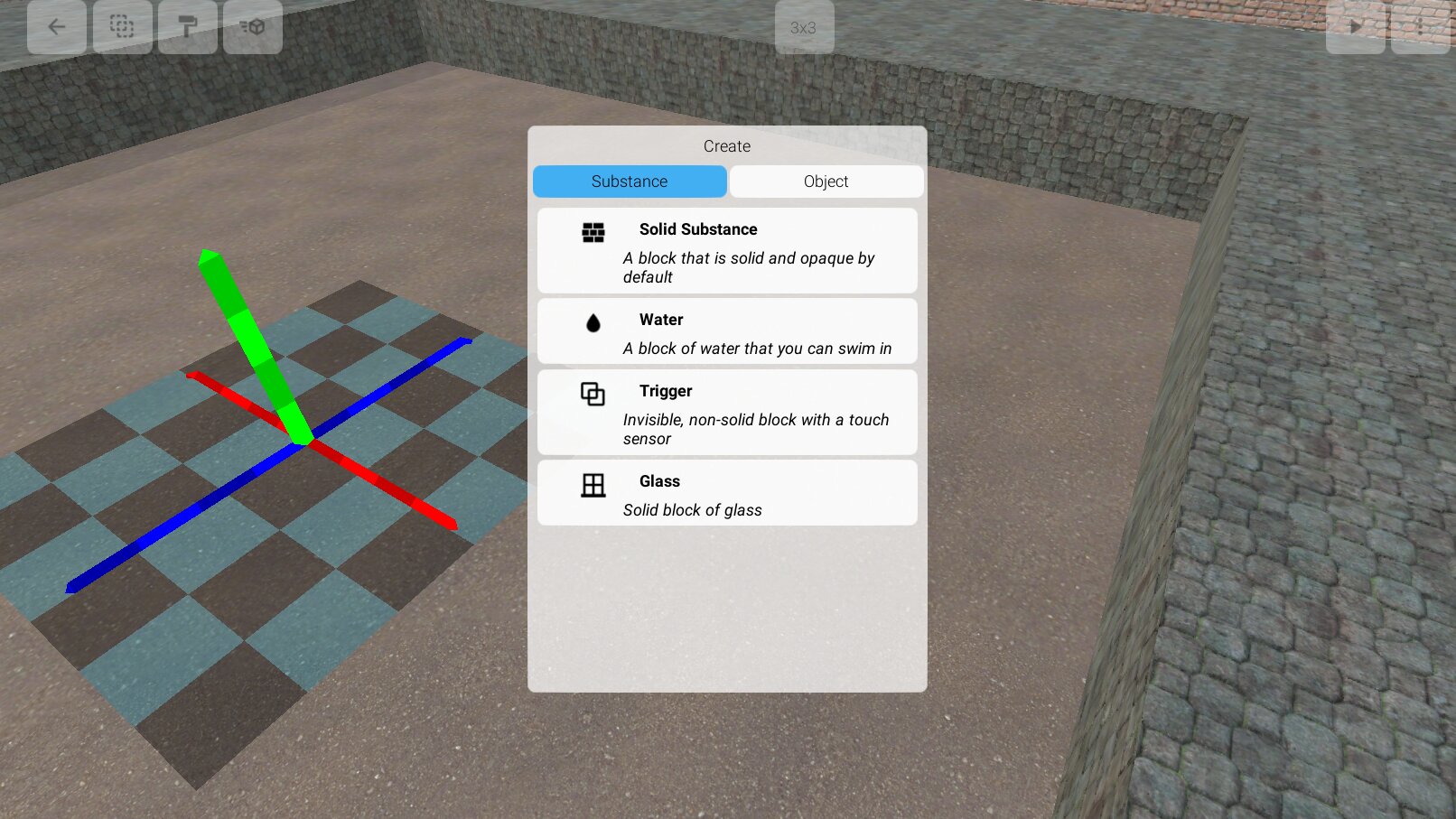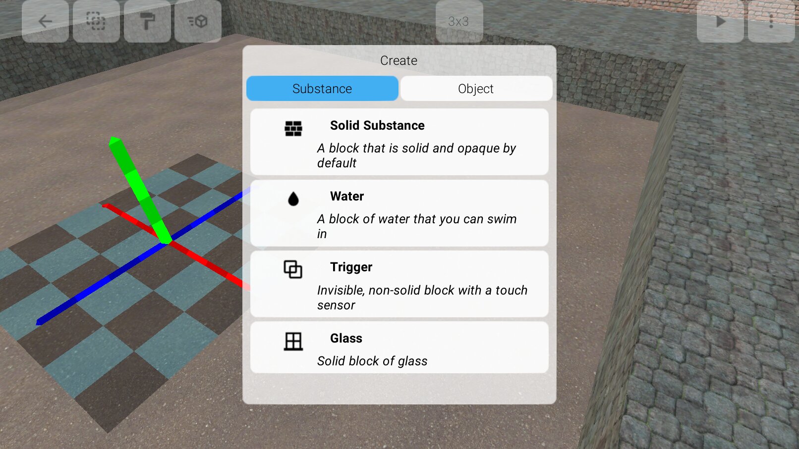 Приложение предлагает продвинутые инструменты вроде «Скоса» для сложных форм и «Веществ» для добавления динамики — воды, физики объектов и других интерактивных элементов. Вы можете создавать целые игровые механики с помощью логической системы, настраивать атмосферу через освещение и эффекты тумана, а затем тестировать свои творения в режиме первого лица.
