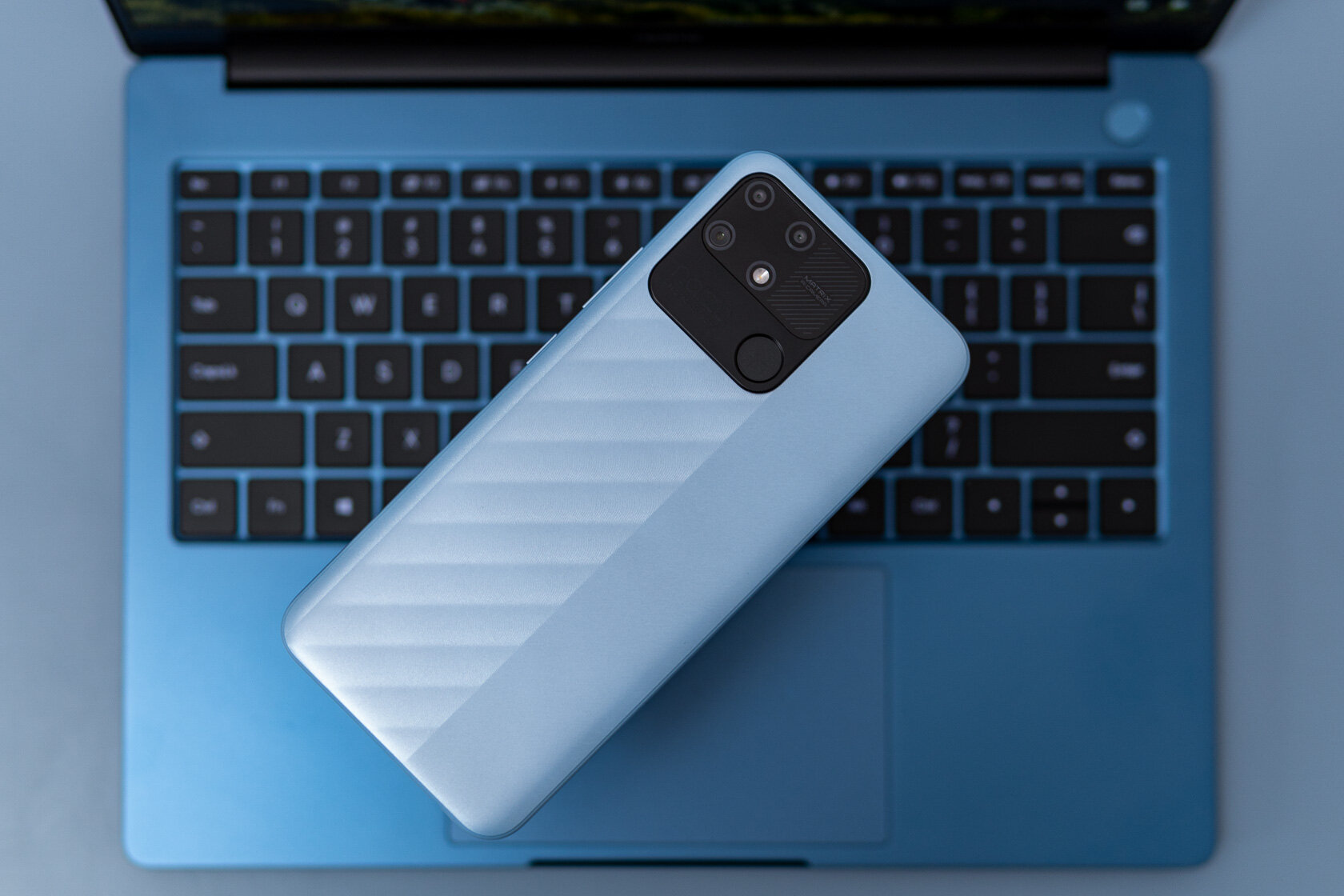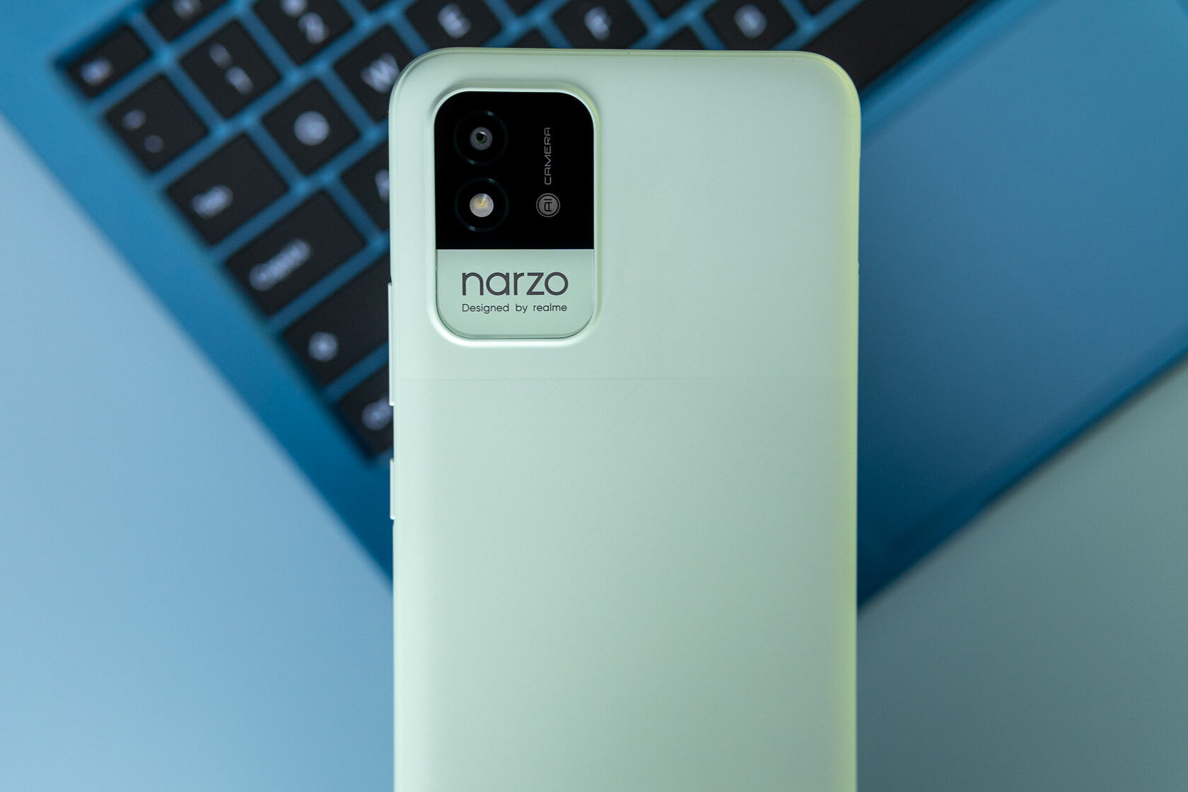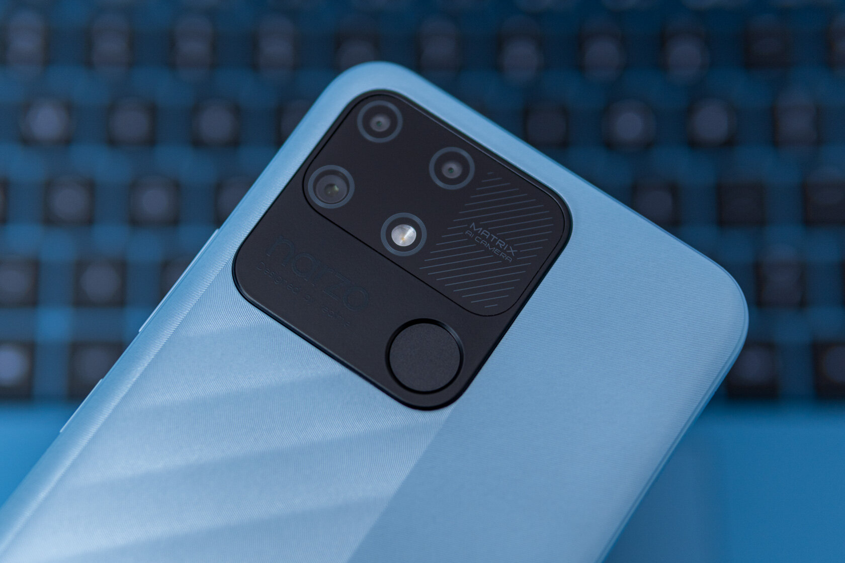 narzo 50A также выделяется на фоне всех конкурентов интересным синем цветом задней крышки. Это такой же текстурированный пластик — немаркий и очень износостойкий. Отличительной чертой является необычное оформление основной камеры, в массивный блок также интегрирован сканер отпечатков пальцев.
