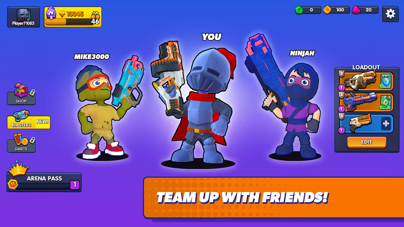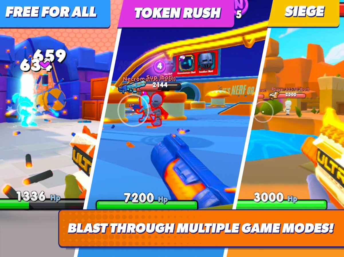 В игре NERF: Battle Arena игроки могут подбирать бластеры в соответствии со стилем игры. Также доступен большой выбор режимов игры. Подберите своему персонажу экипировку, прокачивайте его навыки, разрабатывайте стратегию. Это всё поможет побеждать в быстрых игровых сессиях, каждая из которых длится не больше 3 минут.