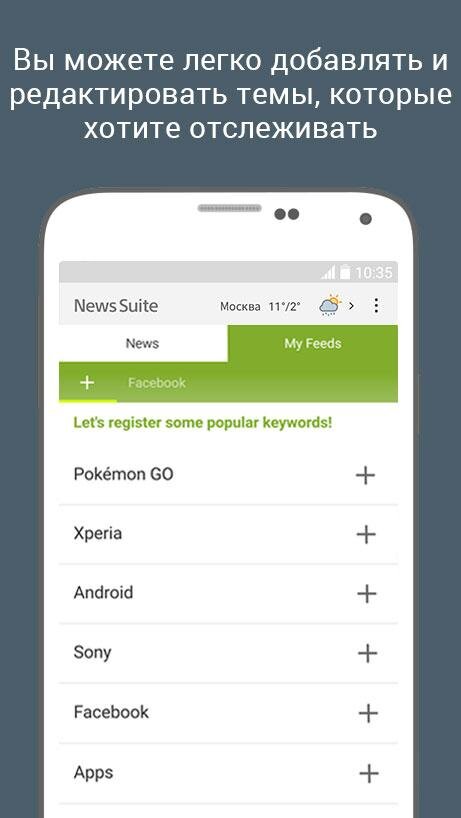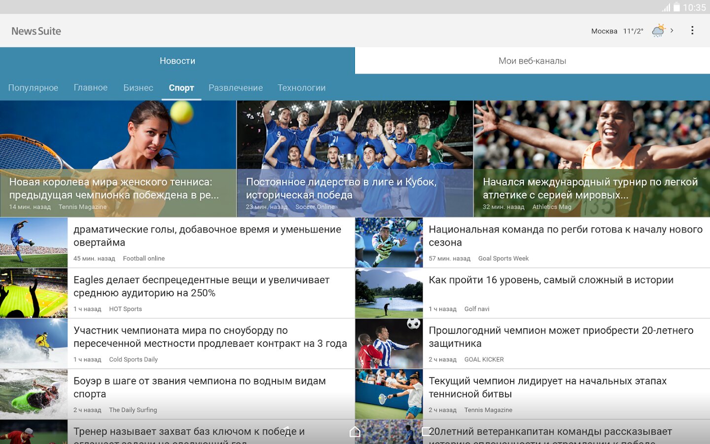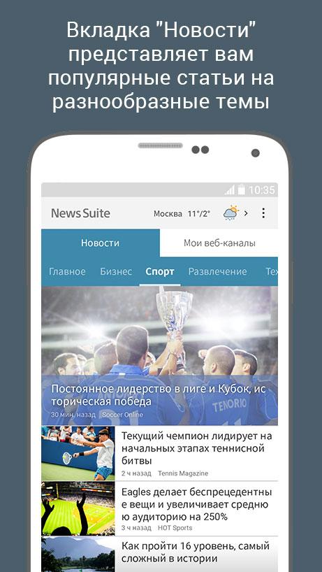News Suite – это приложение для новостей «два в одном», основанное на идее двух вкладок. Переключайтесь между вкладкой «Новости», где можно найти последние текущие новости, и вкладкой «Мои веб-каналы», где можно прочитать новости, отобранные в соответствии с вашими интересами.