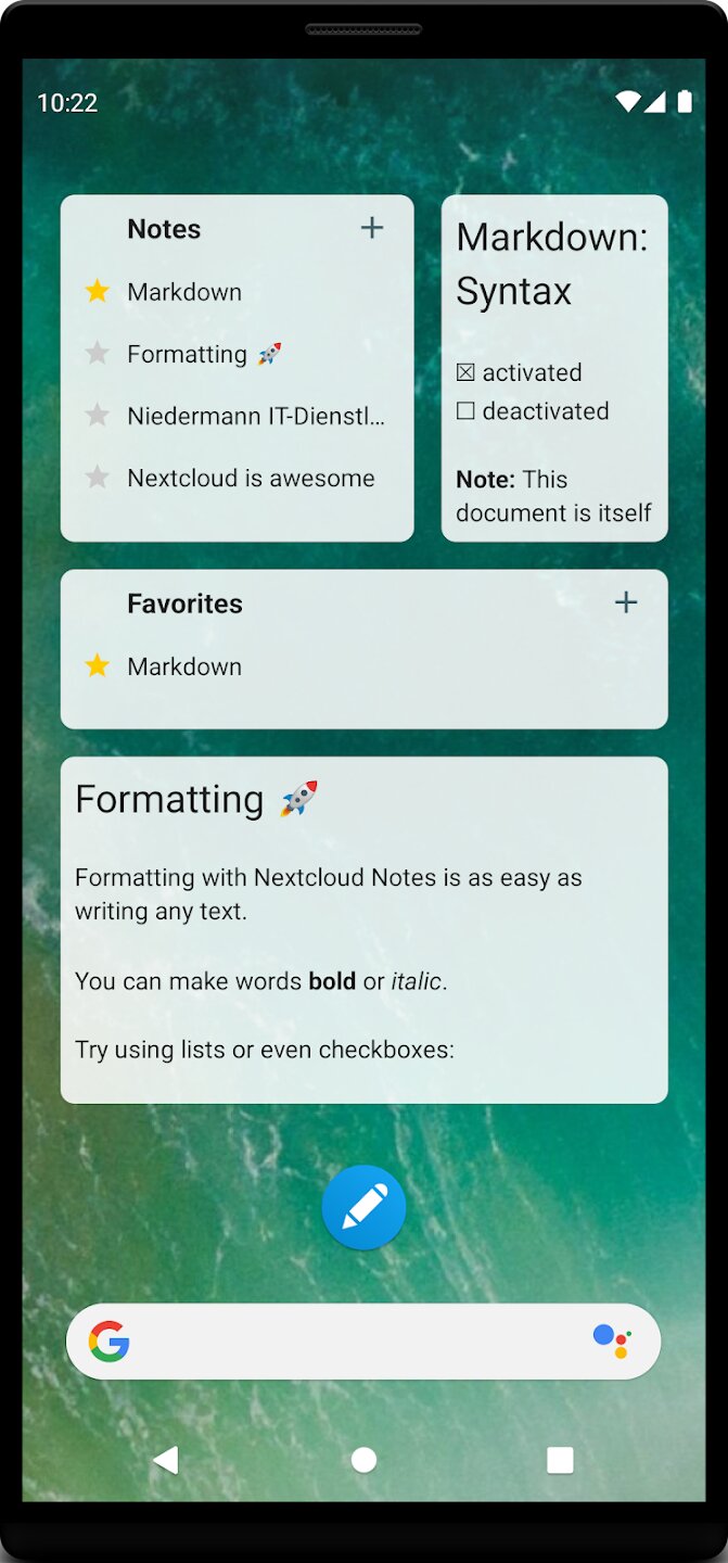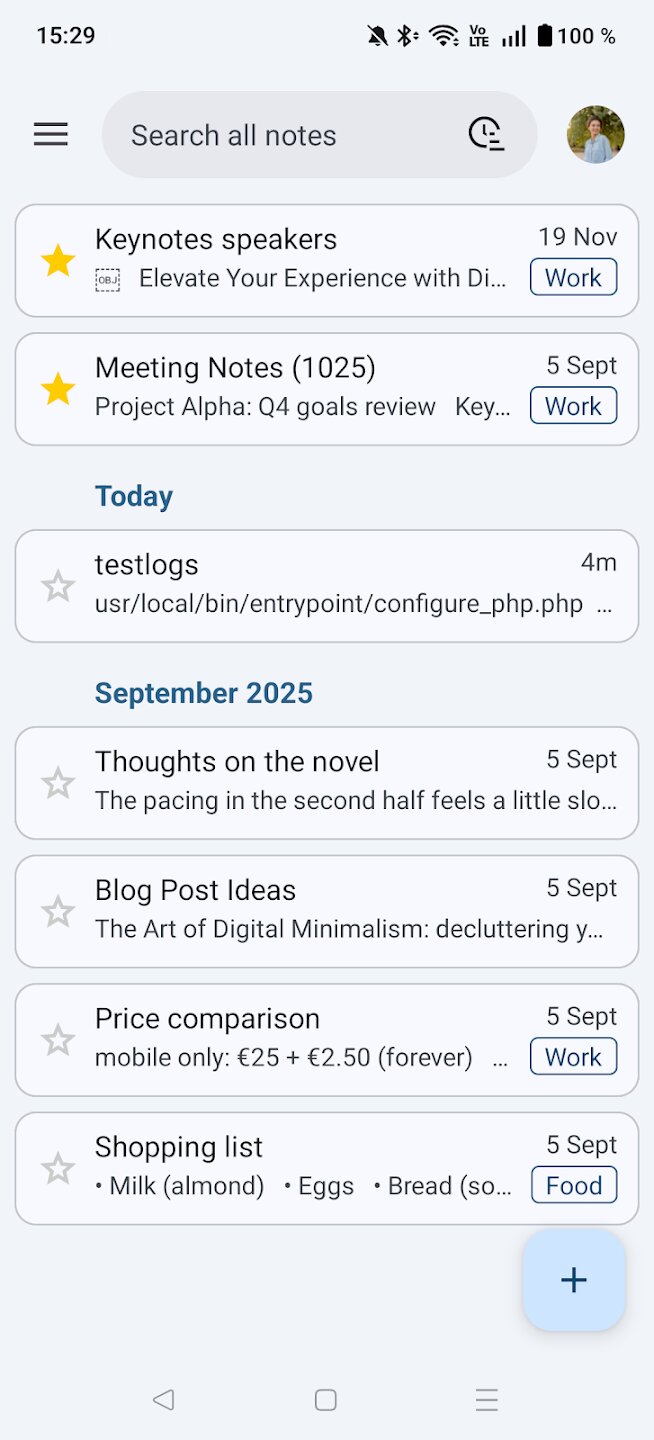 Nextcloud Notes — это клиент для Android, предназначенный для работы с популярным сервером Nextcloud Notes, который позволяет управлять всеми вашими заметками прямо с мобильного устройства. Это приложение бесперебойно синхронизируется с вашей локальной или облачной инстанцией Nextcloud; для его правильной работы требуются как серверное приложение Nextcloud Notes, так и приложение Nextcloud Files. Вы можете работать с несколькими учетными записями одновременно, что делает приложение идеальным решением для пользователей, которые разделяют рабочие и личные заметки.