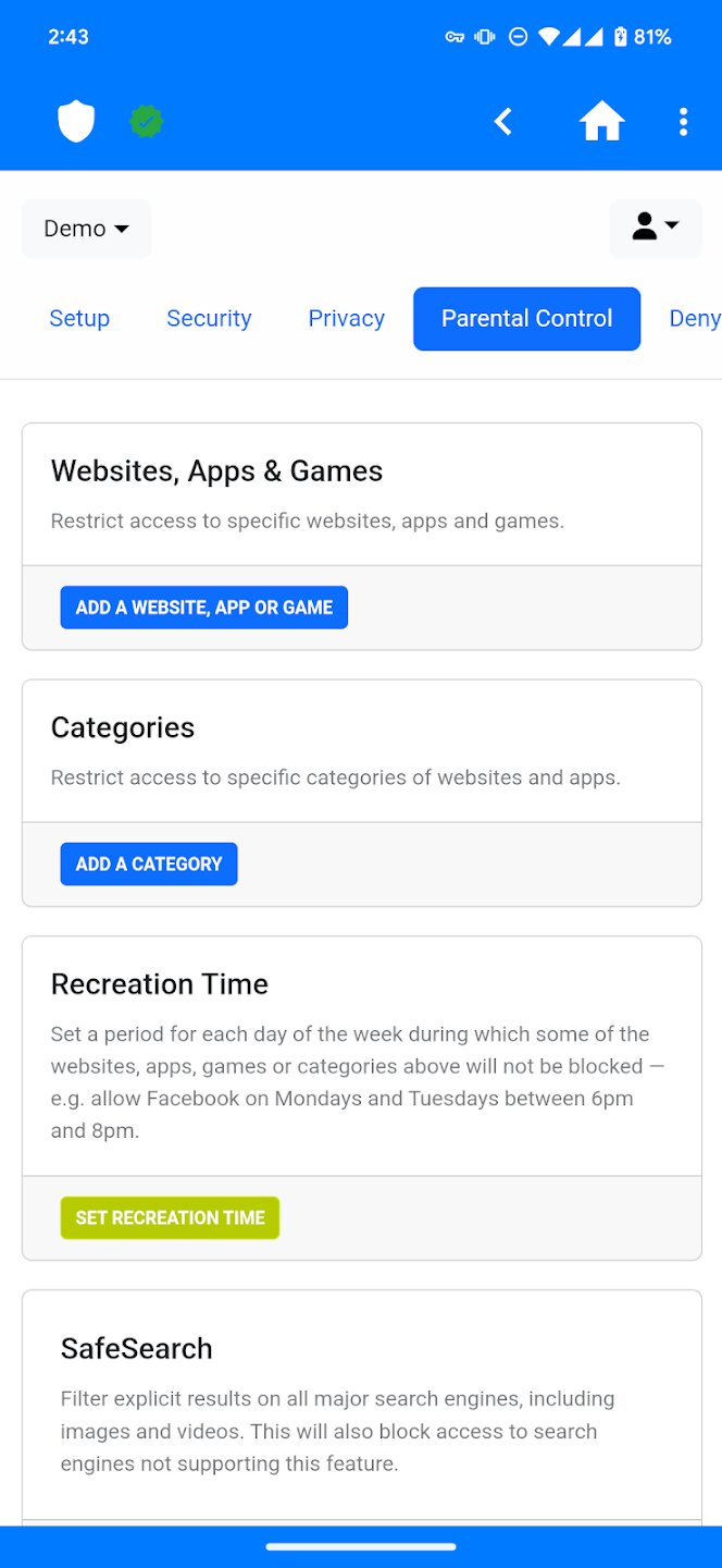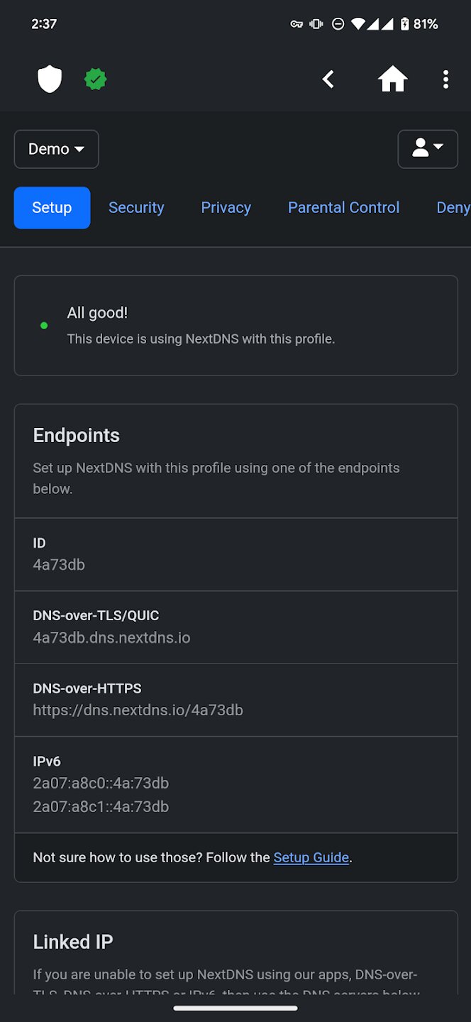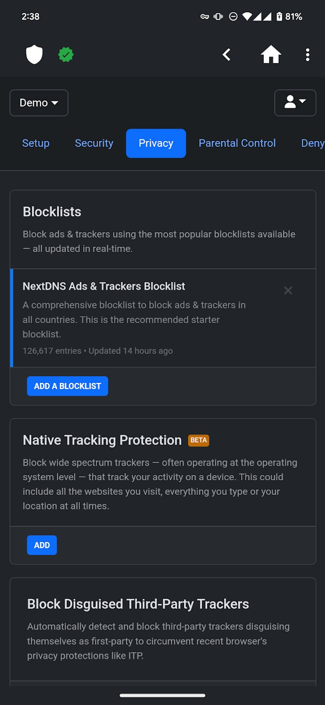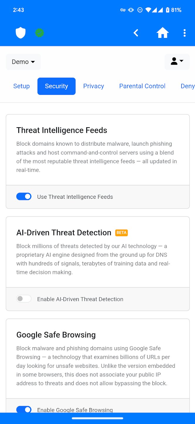 - Полный контроль над настройками NextDNS, включая режимы фильтрации и списки.