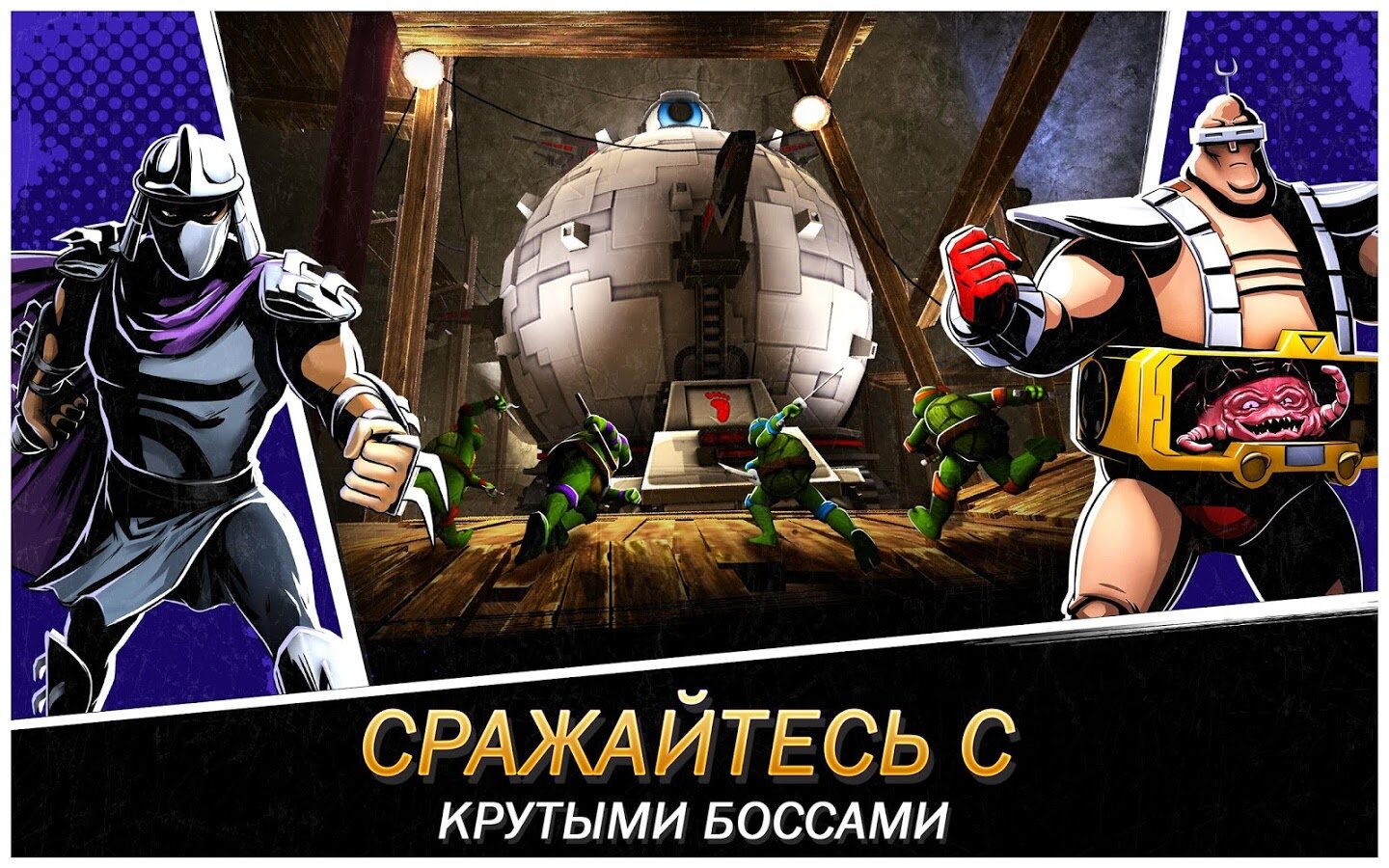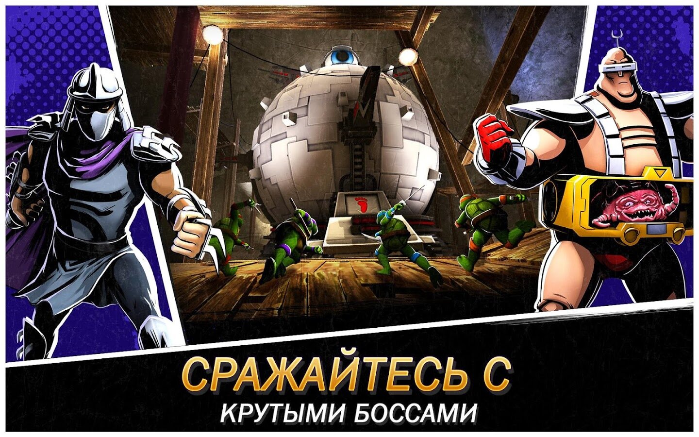 Совершенно новая глава, где за основу взят блокбастер Черепашки-ниндзя-2. Вы получаете возможность создать суперкоманду настоящих отважных бойцов из 30 персонажей игры. А собирая в процессе игры бонусы, постоянно совершенствуете и усиливаете вашу команду! Сражения происходят на крышах гигантских небоскребов Нью-Йорка и в Икс измерении.