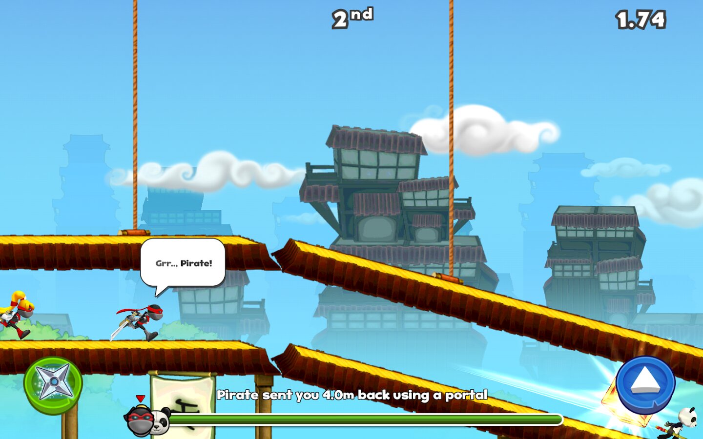 NinJump Dash — веселые забеги с друзьями в реальном времени с вашими любимыми персонажами из NinJump. Участвуйте в гонке с тремя другими игроками, обходите препятствия, применяйте супер-способности и всячески мешайте своим соперникам прийти к финишу первыми. Стреляйте ракетами, бросайте звезды и используйте порталы, чтобы обогнать соперников. Одевайте вашего героя в различные костюмы, делая его неповторимым и индивидуальным.
